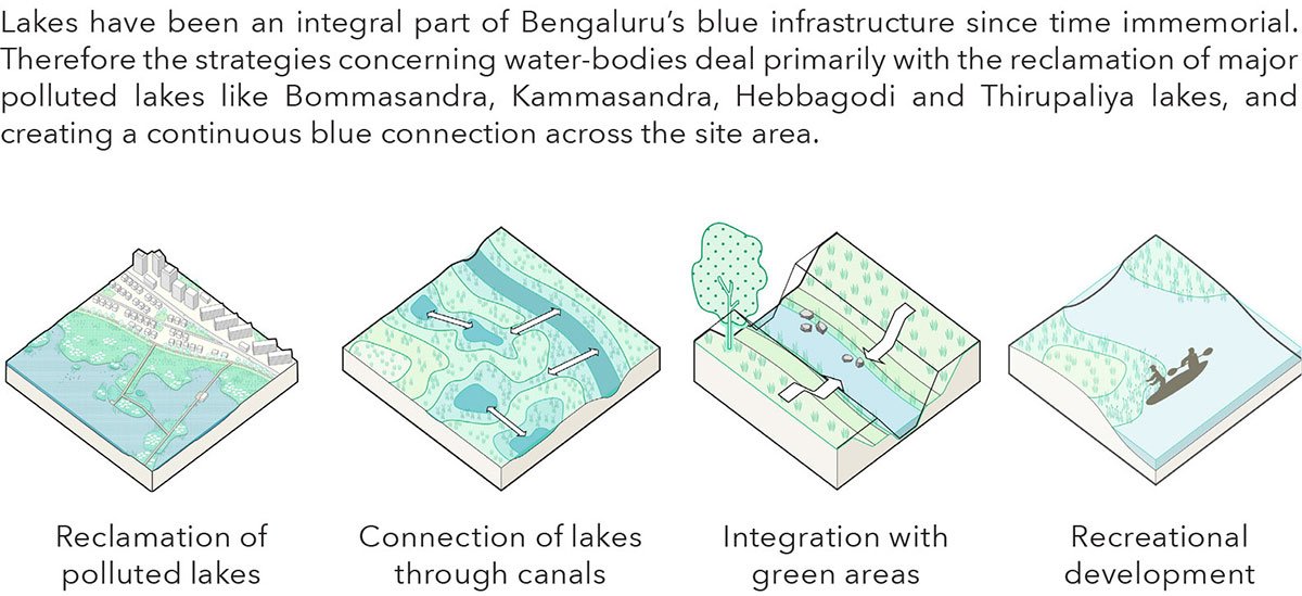 The evaluation of the Electronic City’s site was divided into four sections—Blue Infrastructure, which examined the area’s lakes and canals for quality; Green Infrastructure, which highlighted the presence of protected forests and agricultural fields in the surrounding area; Land Use and Socio-Cultural, which studied the presence of diverse built infrastructure typologies in the study area; and Transport Network, which demonstrated the linkages of the study area with other significant areas of Bengaluru.