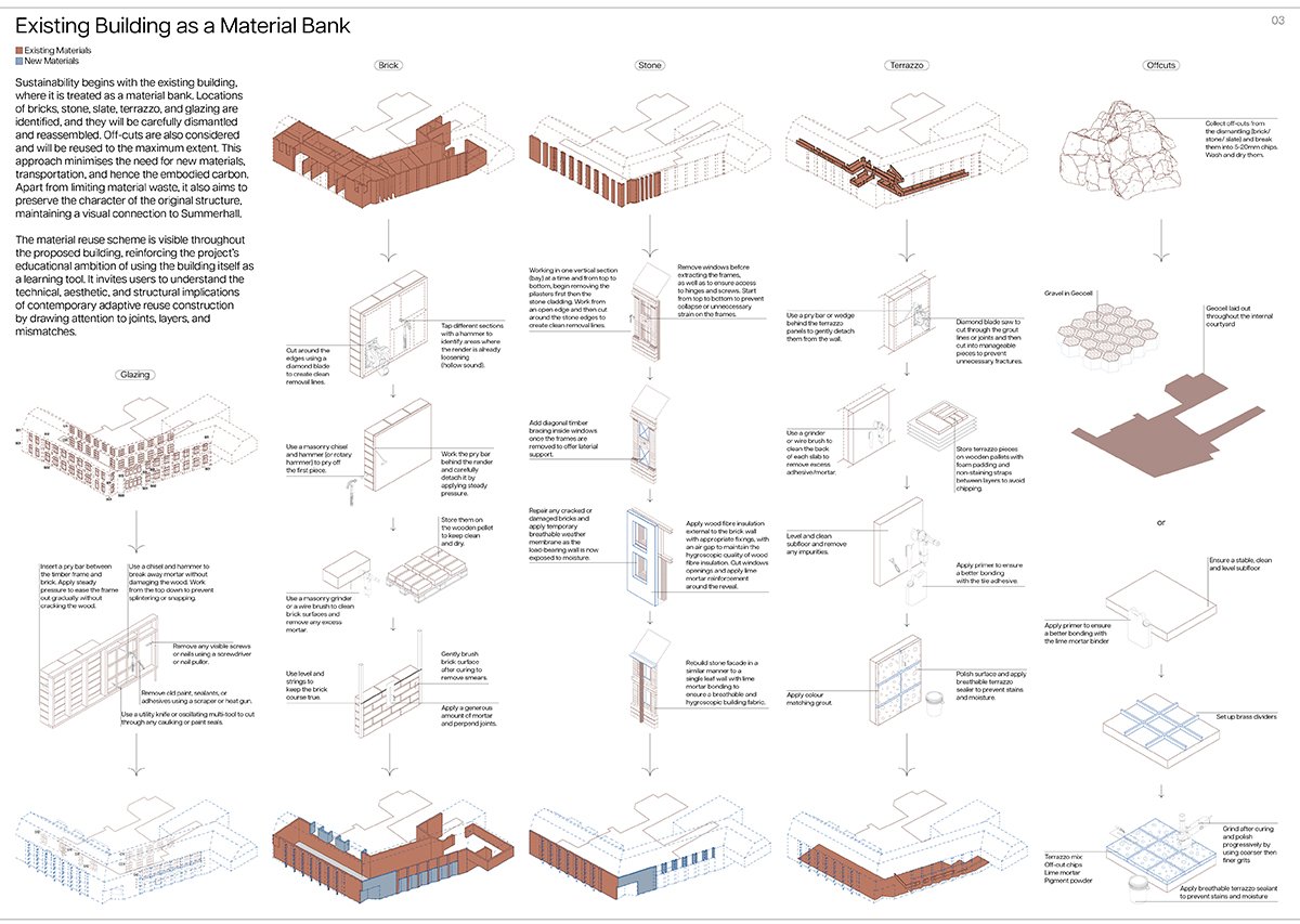 Sustainability begins with the existing building, where it is treated as a material bank. Locations of bricks, stone, slate, terrazzo, and glazing are identified, and they will be carefully dismantled and reassembled. Off-cuts are also considered and will be reused to the maximum extent. This approach minimises the need for new materials, transportation, and hence the embodied carbon. Apart from limiting material waste, it also aims to preserve the character of the original structure, maintaining a visual connection to Summerhall.