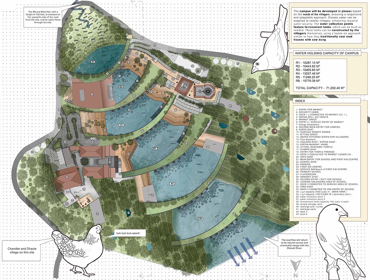 The final outcome is a comprehensive master plan that reimagines water as both an ecological system and a spatial organizer for rural life. The campus is structured around a cascading series of reservoirs with a total water-holding capacity of 71,202.45 m², ensuring year-round recharge, storage, and controlled overflow back into the Dhavli River. These reservoirs define terraced levels that host community functions, balancing conservation with everyday use.