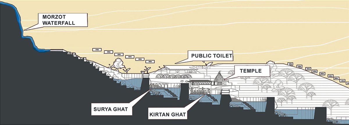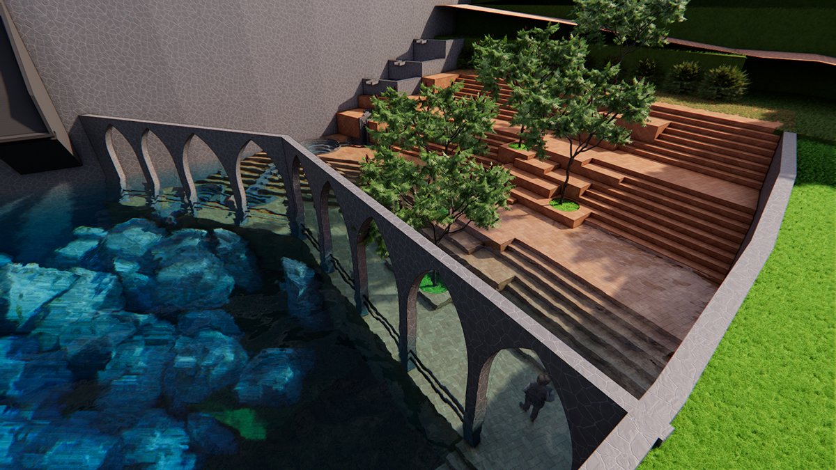 Structures become conduits, reservoirs, and interactive spaces where water movement is both functional and experiential. The harmonic tension between these elements fosters a dialogue where movement is guided yet unrestricted, and structure is rigid yet responsive. This approach creates an environment where water and architecture exist in symbiosis.Beginning with a site featuring a natural stream, introducing cascading reservoir walls, and finally integrating stepped structures and ghats to harmonize with the terrain while minimizing disruption.