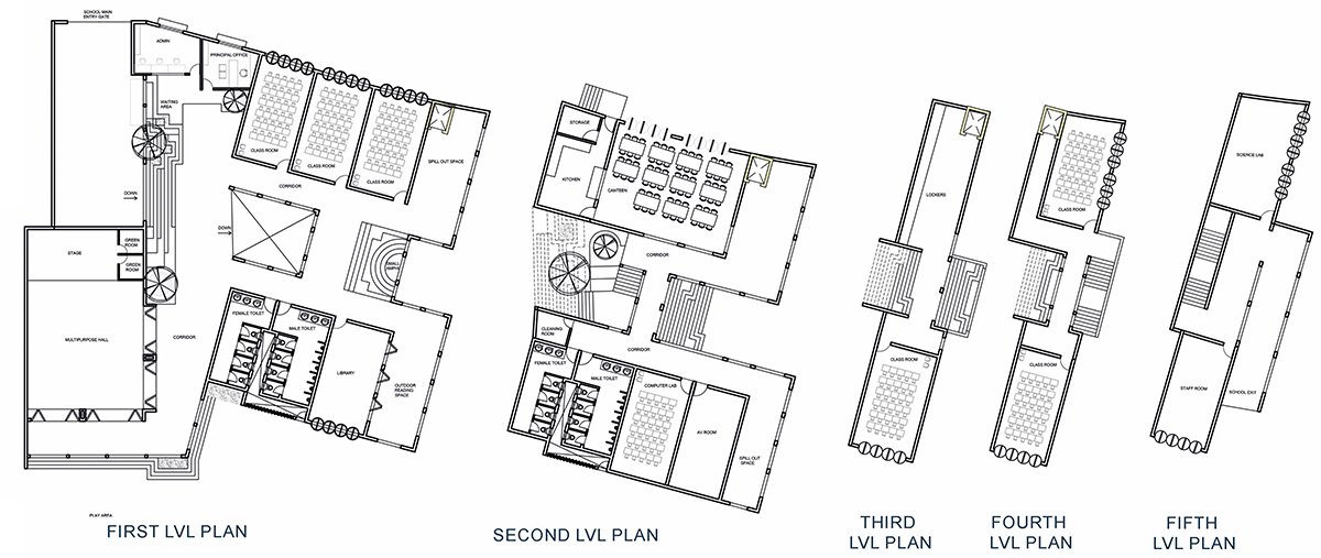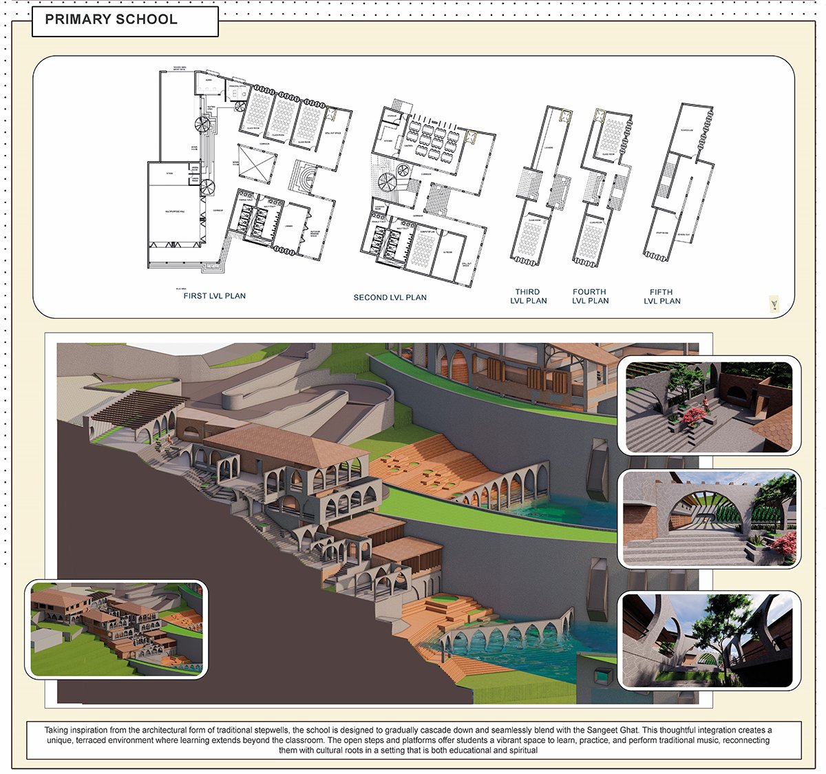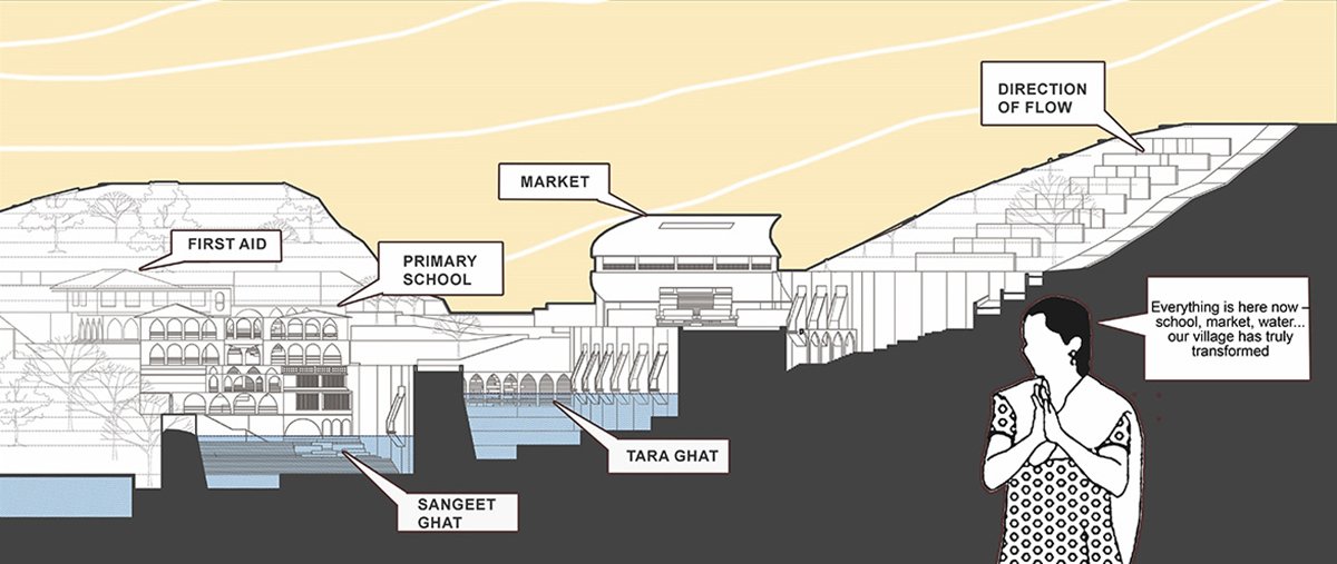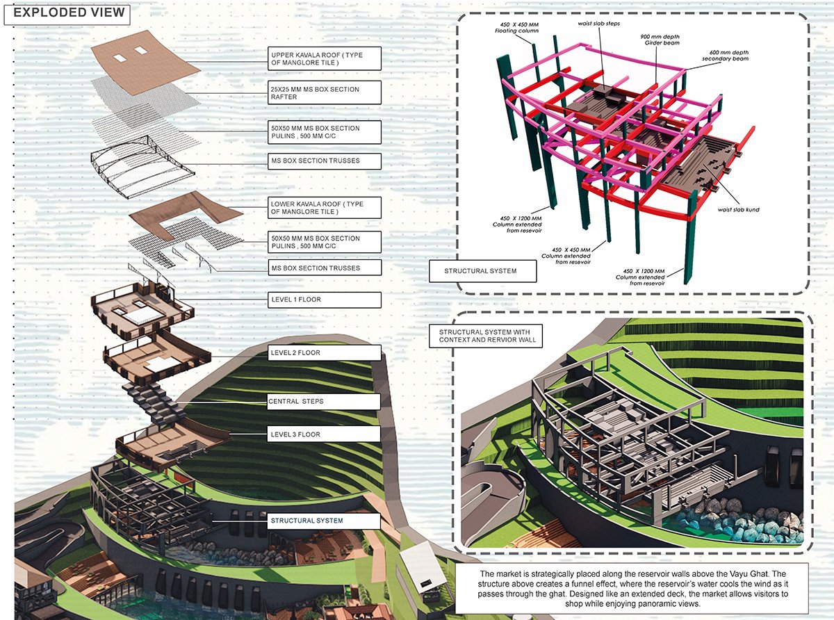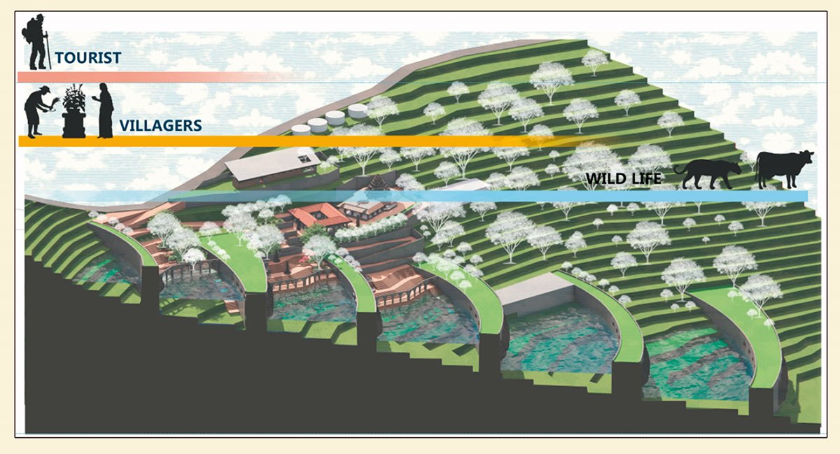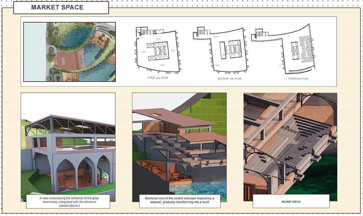 The design integrates markets, temples, schools, ghats, and gathering spaces, each strategically positioned along the stepped landscape. For instance, the market is located near the village approach to serve as a hub for exchange, while the school terraces align with water channels, allowing education to connect directly with ecology. The temple and ghats occupy the spiritual heart of the plan, reinforcing cultural rituals tied to water.