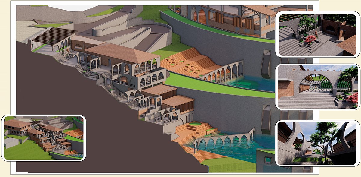 Through iterative sketches and diagrams, the form was developed along the direction of the natural water stream, creating a cascading reservoir system. This approach allowed the design to follow the terrain, minimizing disruption while embedding water as the spatial organizer. Digital models further refined the stepped geometry, showing how built functions like markets, schools, and gathering areas could integrate with water-holding terraces.