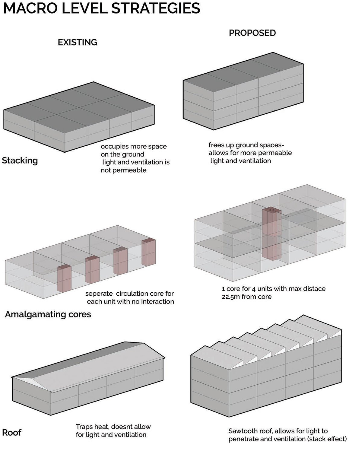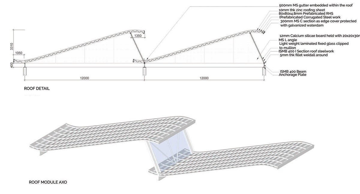 The design of the factories is based on the fundamental need for human comfort, and it aims to create a microclimate within the buildings that is suitable for the working conditions of the garment industry. This microclimate allows for sufficient light, ventilation, cooler temperatures, and reduced noise emissions in Bhiwandi’s hot and humid climate. In addition to serving as an architectural feature, the sawtooth roof, which is characteristic of factory buildings, creates volumetric double-height spaces that facilitate cross ventilation for temperature maintenance and heat escape.