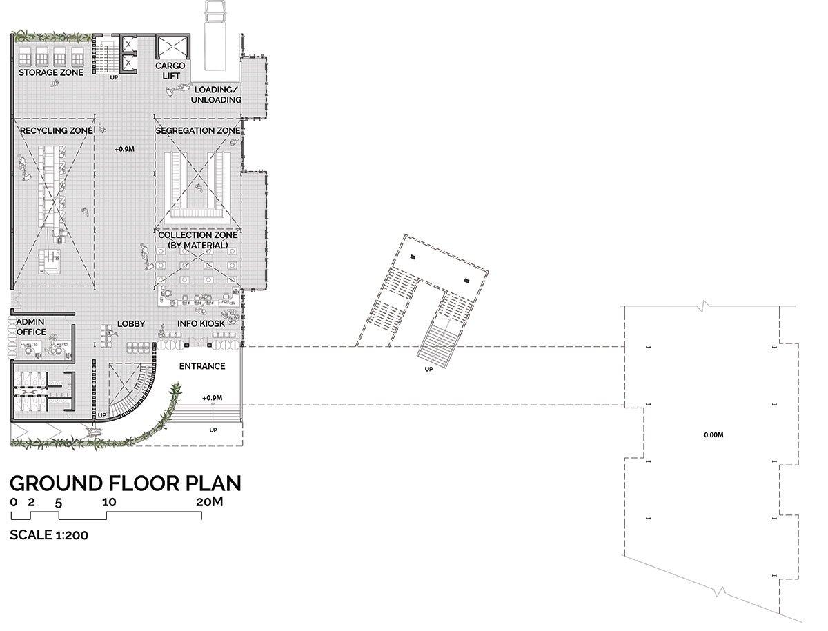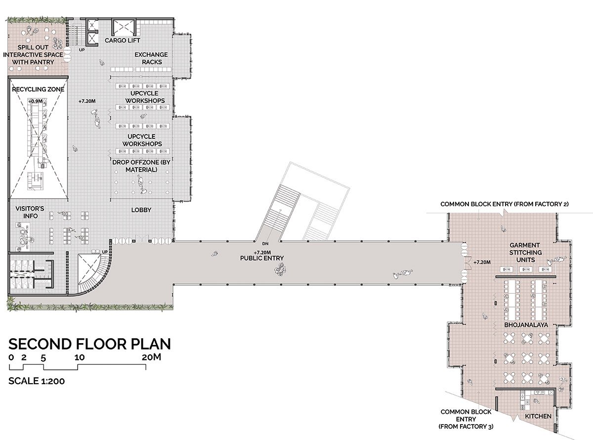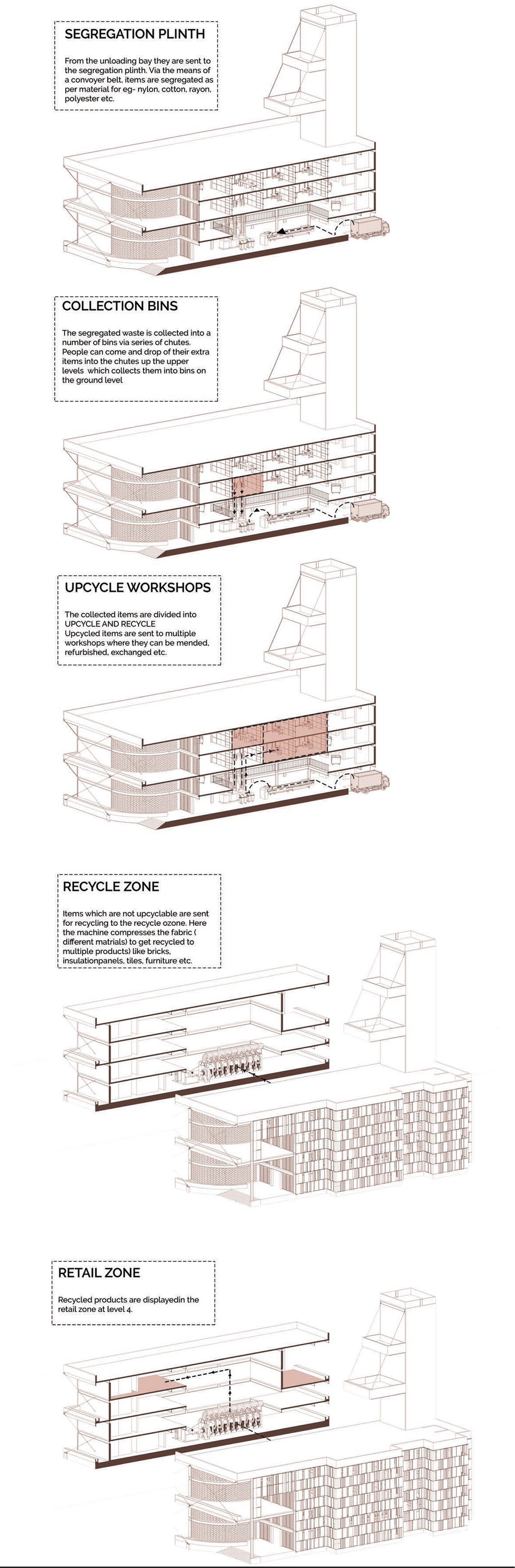 Due to the project’s significant environmental implications, the textile industries are also required to establish a Waste Recycling Facility. This waste recycling facility takes a multifaceted approach to recycling, upcycling, mending, and refurbishing fabric waste so that it can be used again for furniture, bricks, tiles, insulation panels, or even upcycled into new clothes. Closing the loop, it also uses incentives to entice people to come and get rid of their clothes.