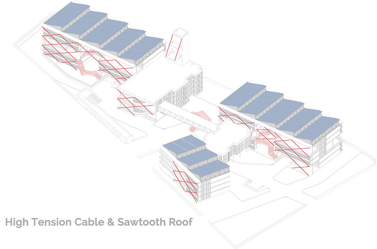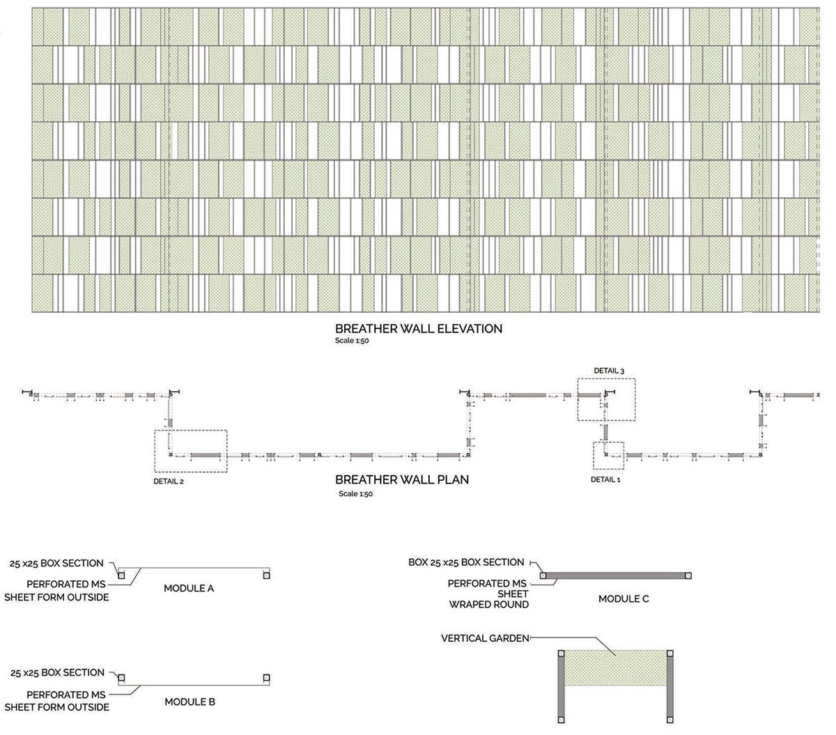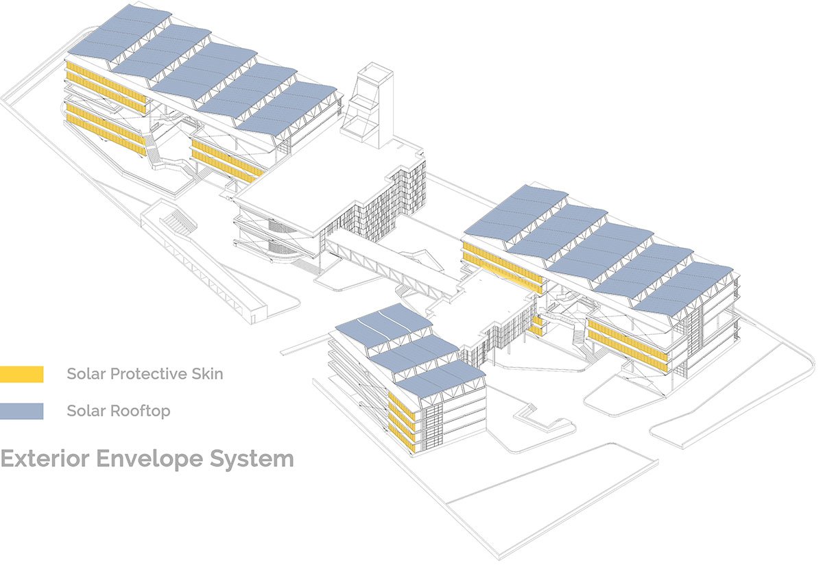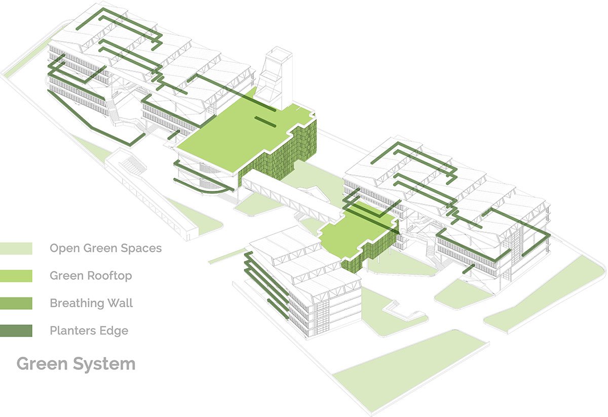 The project consists of three factory buildings connected by a common area and a waste recycling facility. It integrates several green systems, such as planter edges, breather walls, and green roofs, to handle the intervention, and its envelope system consists of solar roofs and solar-protecting louvred skin. The planning and operation of the redesigned factory space depend heavily on these systems.