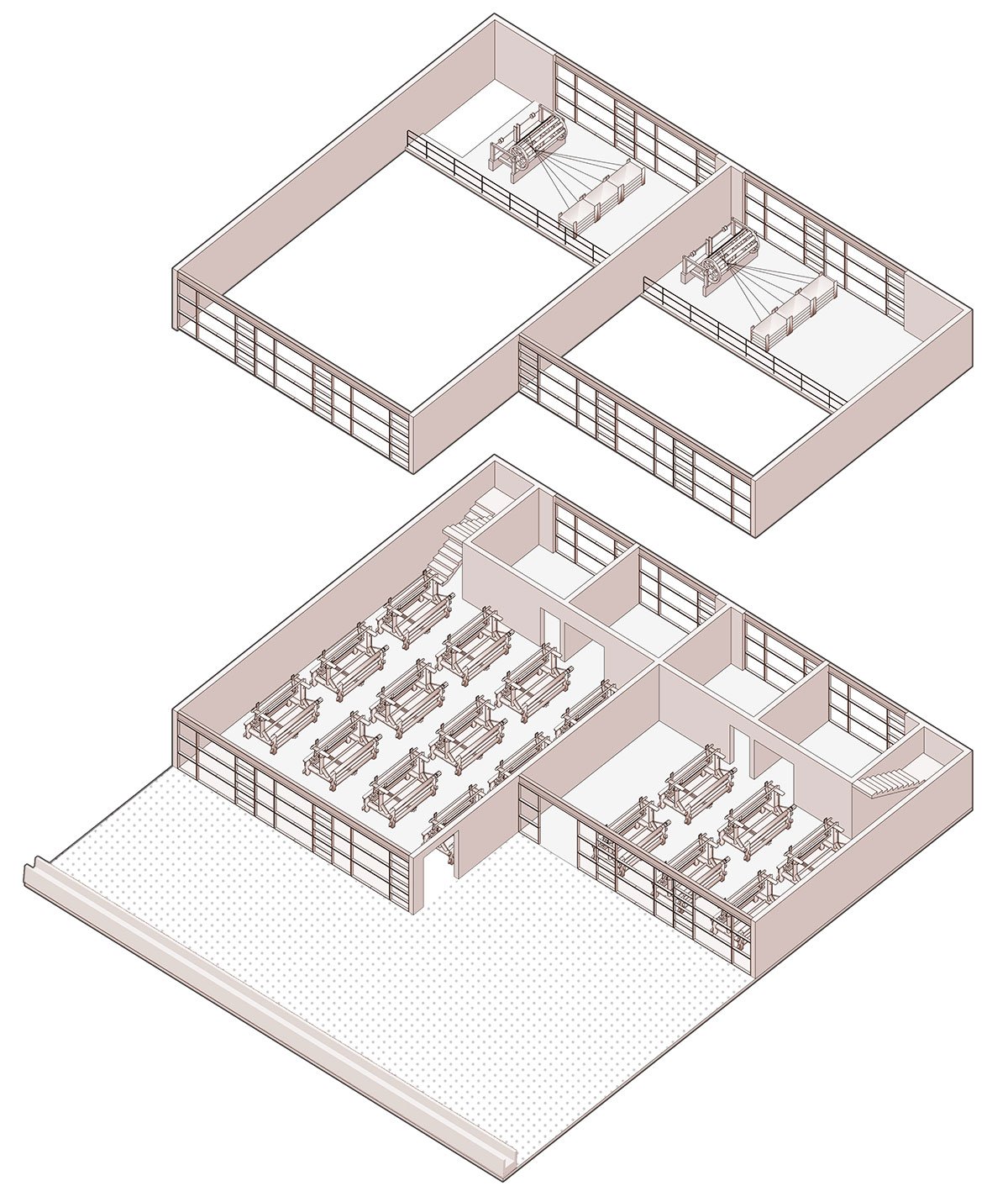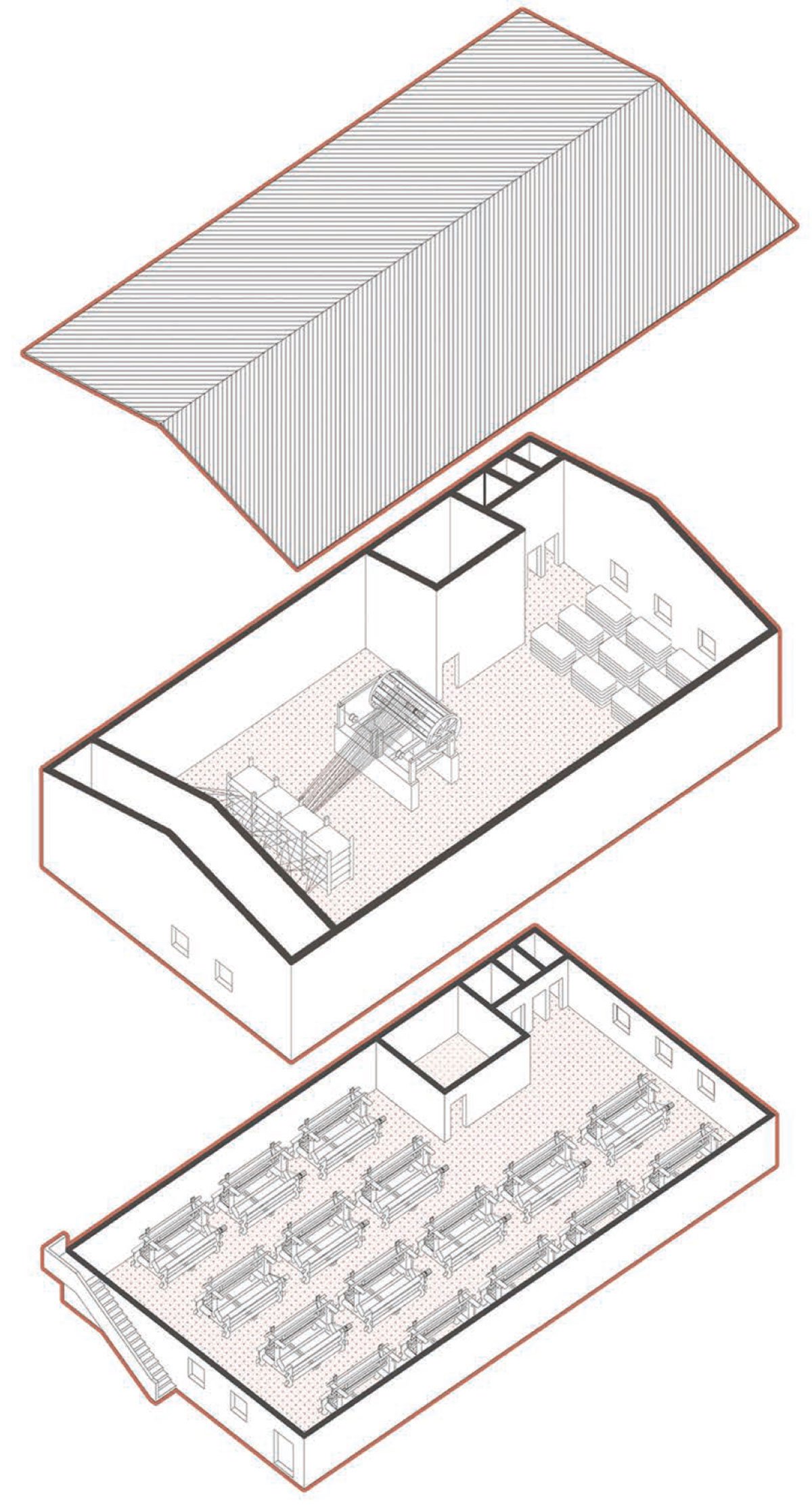 The project aims to reimagine production spaces for the fast fashion industry while exploring a cradle-to-cradle approach for a single piece of fabric. It views the act of discarding as a transitional stage for the fabric’s second life, with areas designated for gathering, storing, creating, and recycling in order to identify potential alternate uses for the material.