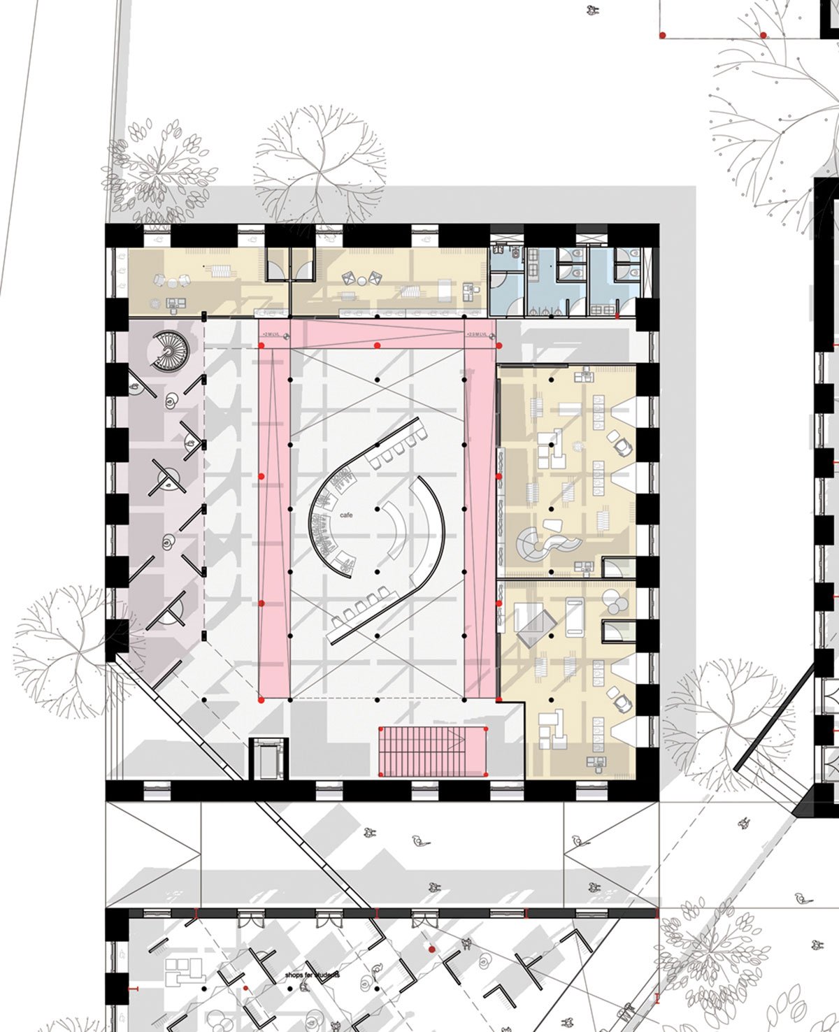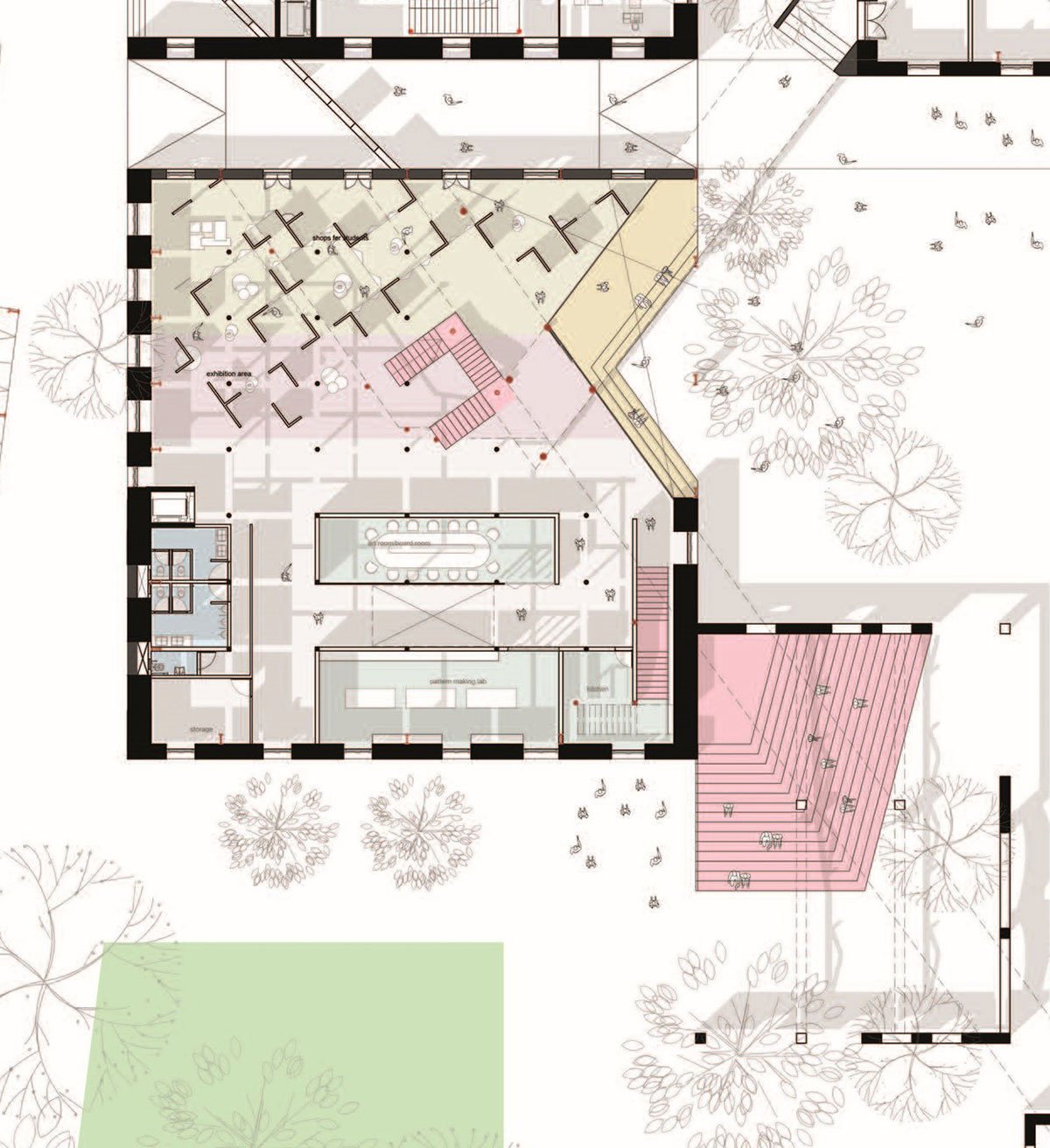 Block B is proposed to be largely classrooms for the institute. To reinforce the existing structure, a portion of the old structure is preserved and a new structure is introduced. While classrooms occupy the first floor, the ground floor transforms from being public near the street to being private at the rear of the building.