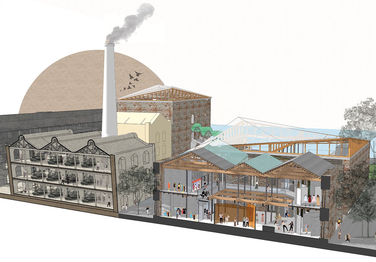 An institute of fashion is proposed to be developed at Mukesh Mill, a cotton mill connected to the textile industry. By establishing a fashion hub, the new programme raises the textile industry from the ashes. The building’s typology, which makes it possible to create studios and a learning environment, provides the form for the educational programme. Additionally, the ruin aesthetic serves as a backdrop for clothing stores, encouraging commercialization.