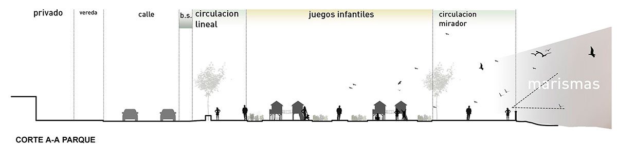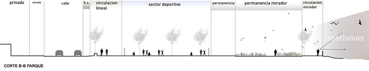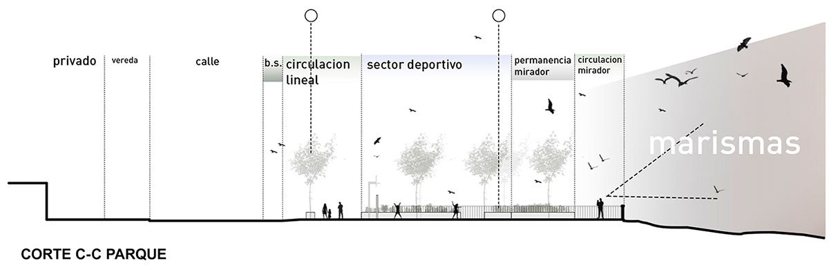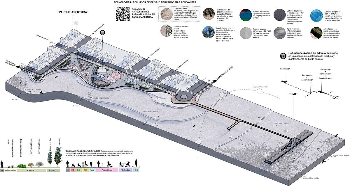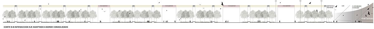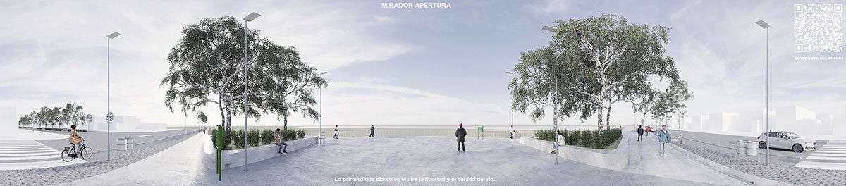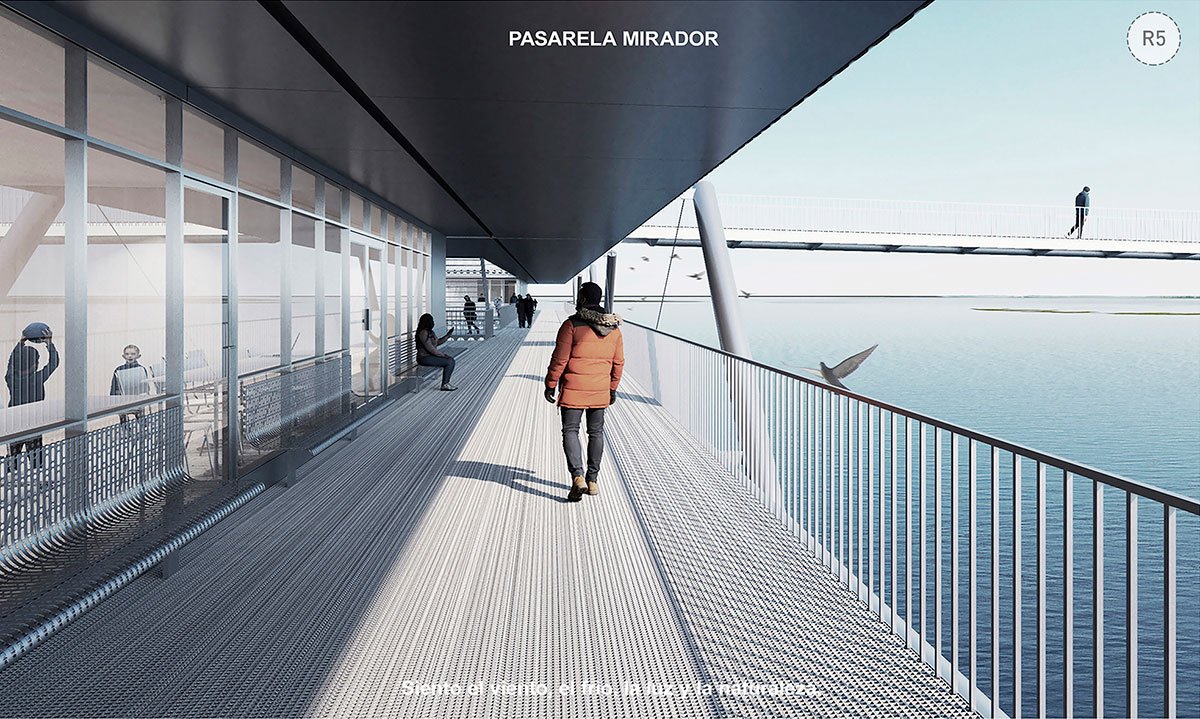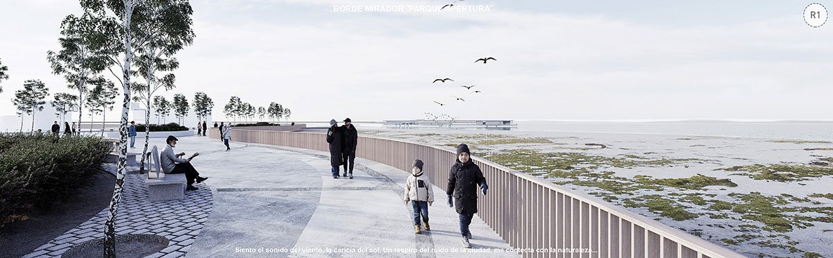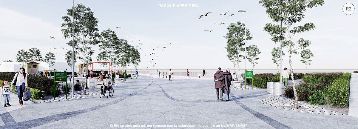 The intervention is designed to guide visitors from the existing public space toward the waterfront using strategically placed elements that emphasize this axis. It is integrated with the Mirador Apertura, which includes parking areas, a dry plaza equipped for contemplation of the marismas and their fauna, and the extension of the coastal route running east to west.
