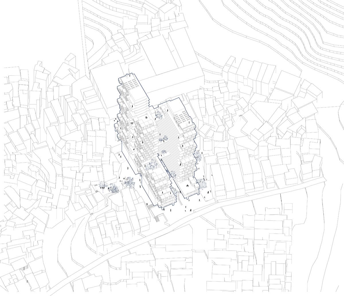 The decision to go vertical was made after a context analysis revealed that the floor space is saturated and the horizontal spread is at its maximum. The residents of the favela chose to have their dwellings stacked vertically because they were reluctant to leave. In an effort to locate space for construction, the favelas are seeking new and higher heights. When the ground is full, there are various possibilities visible in the sky. This vertical project foresees the excessive verticalization that will occur with unstable housing.