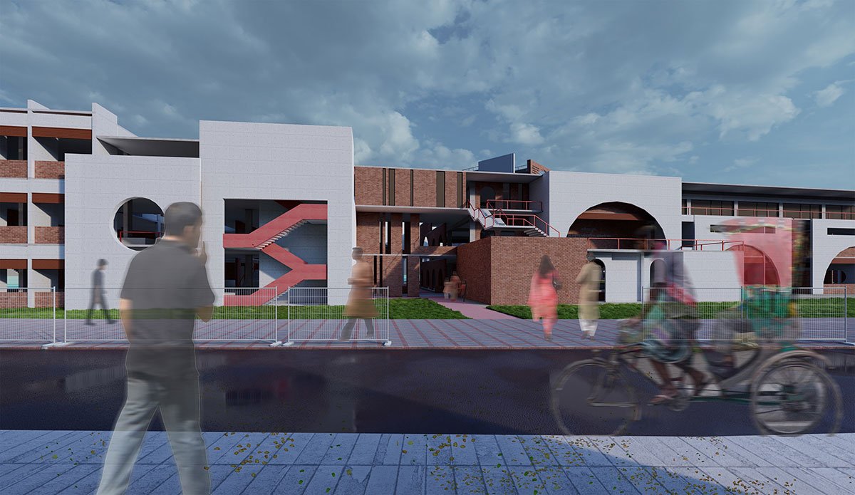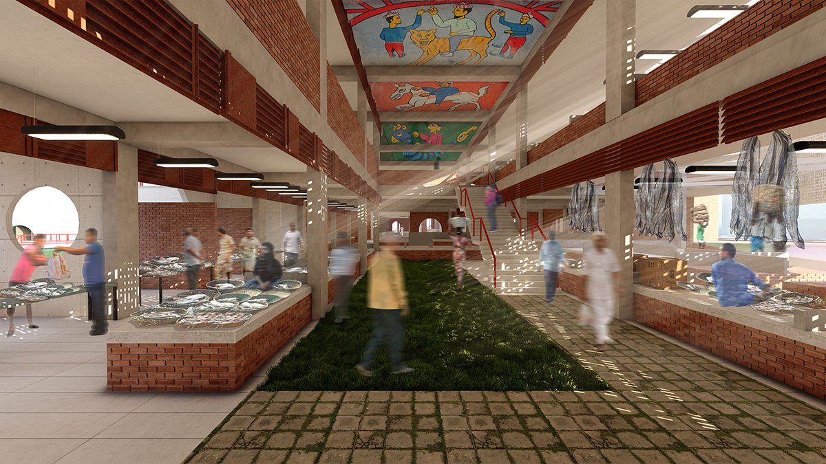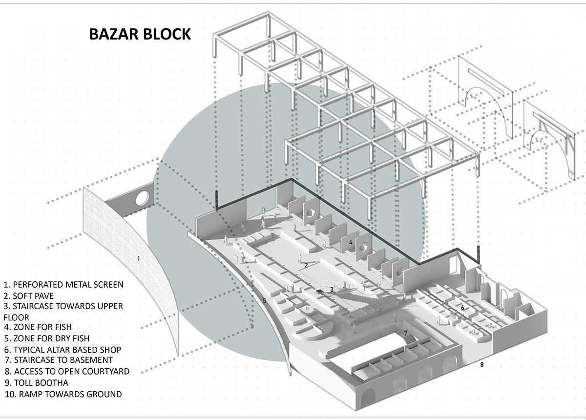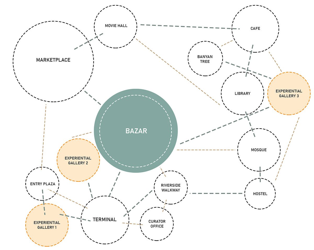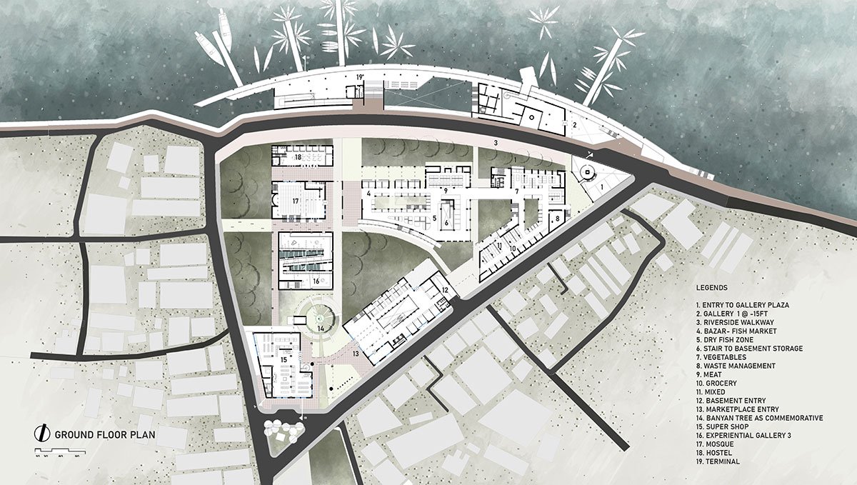 In order to convey the rendezvous, it adds a few additional features and retracts its perimeter to allow access from all directions in the neighbourhood, producing a variety of facilities for the project’s stakeholders as well as the local community and beyond. Along with the conventional Bazar, there is also a mosque, a madrasa hostel, a library, a bakery-café, a theatre, a market, a warehouse, a wholesale dock, and a boat terminal.
