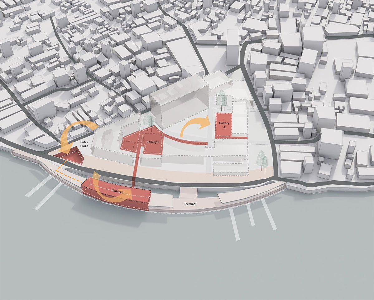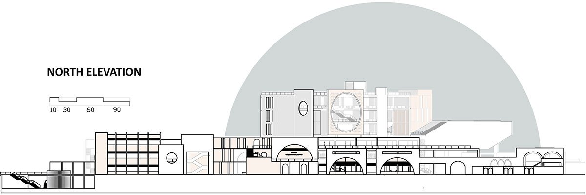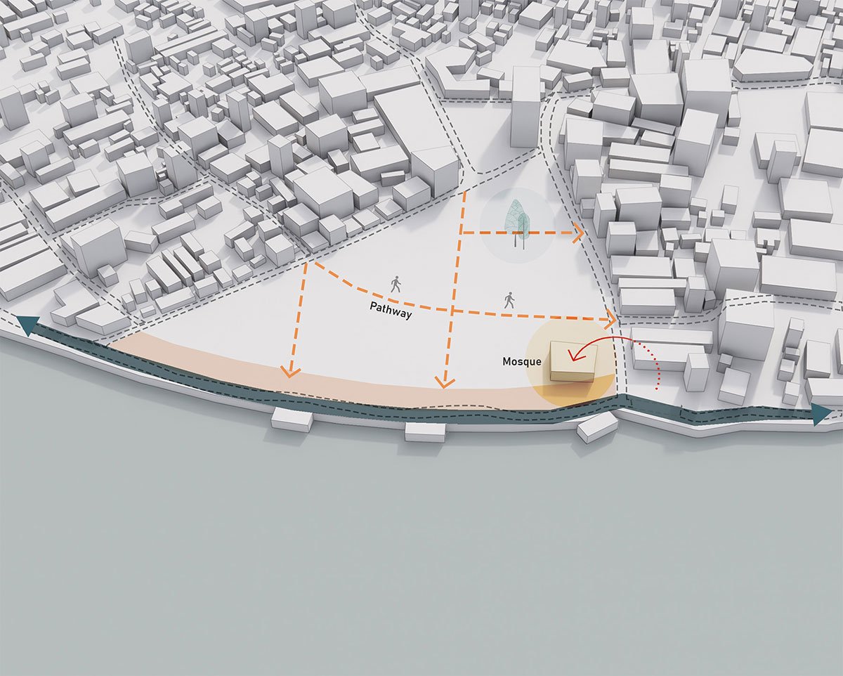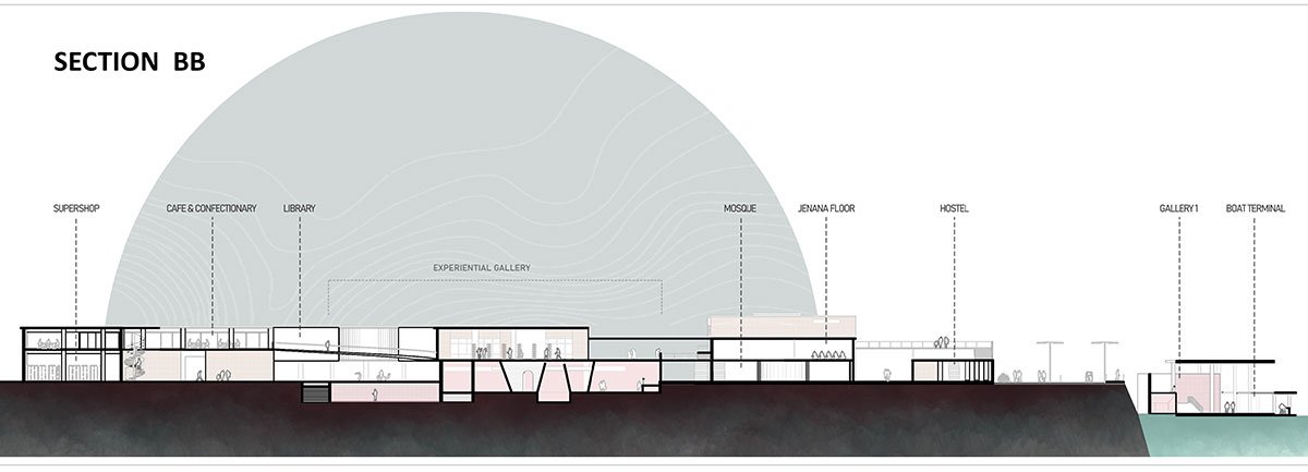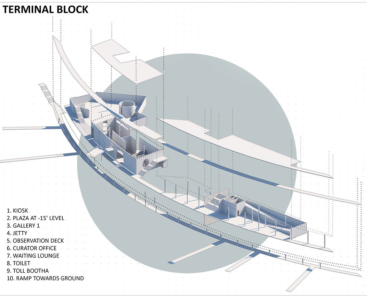 Additionally, a portion of the terminal, including the curatorial office, functions as Gallery 1. The mosque was rezoned, relocated, and equipped with a Jenana floor that can be accessed from the vicinity in order to make accessible road networks uninterrupted.
