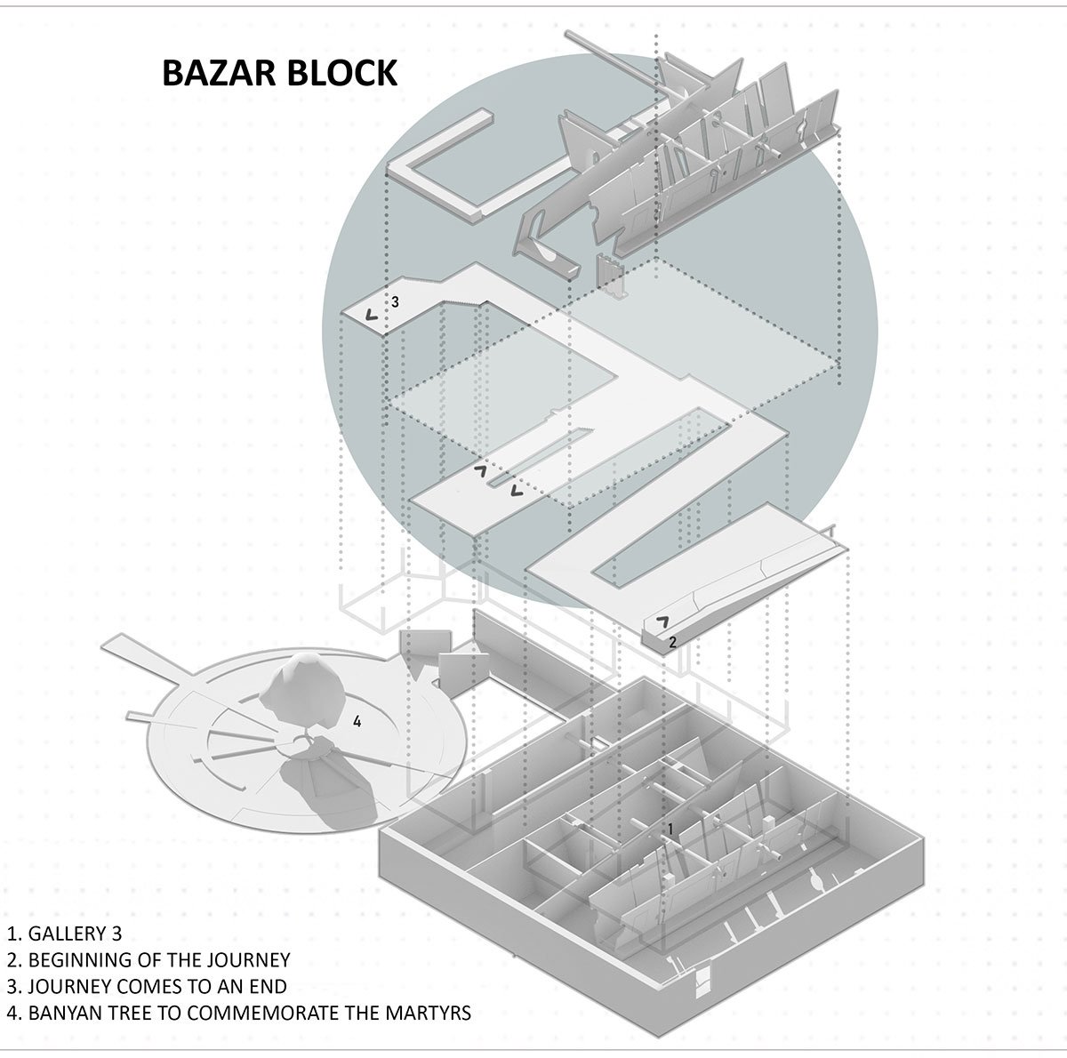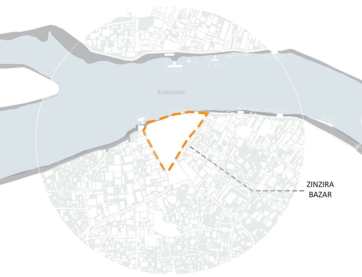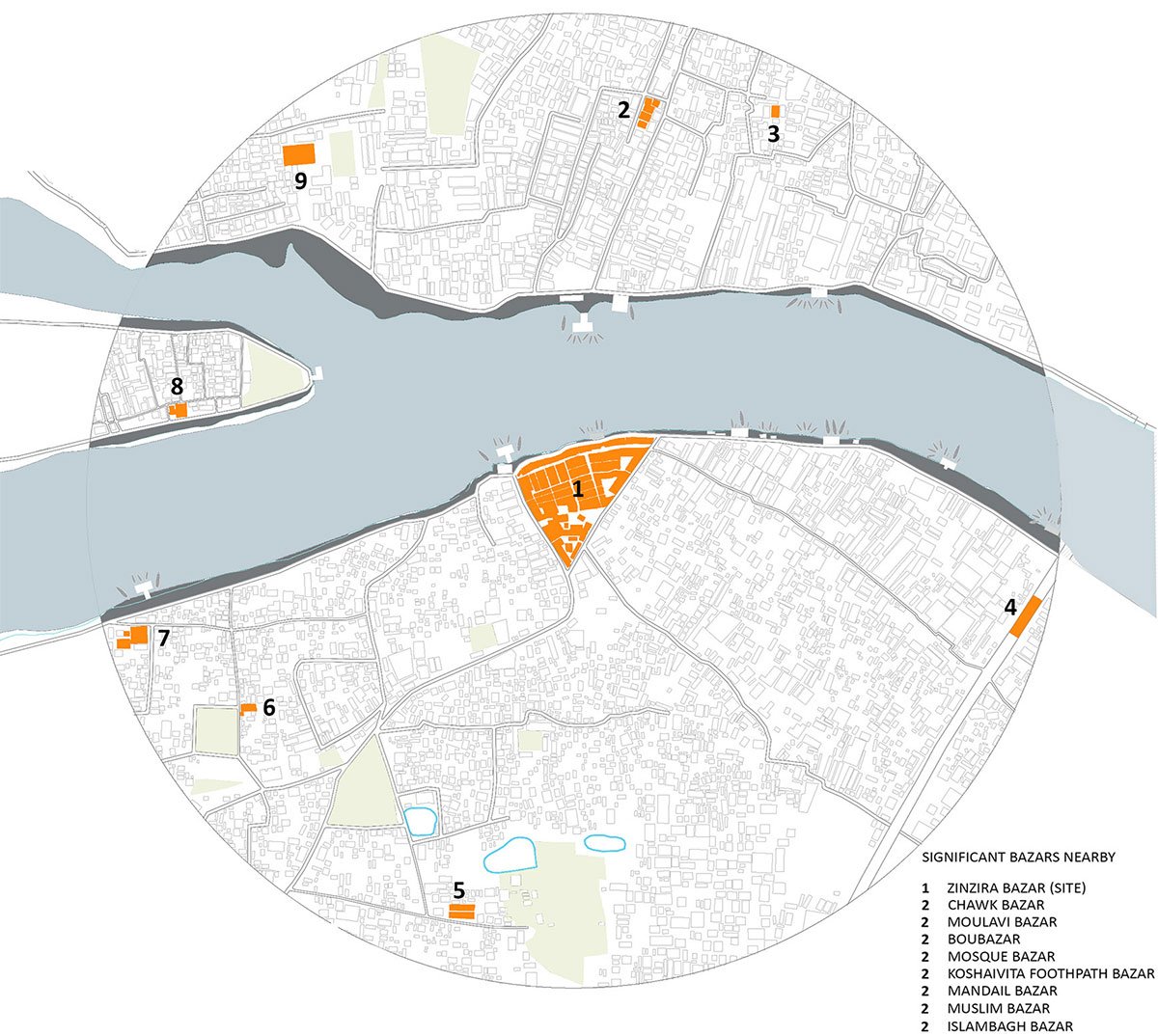 Its site, Zinzira Bazar, could not be demolished in order to construct a memorial considering it is still in use and supports the neighbourhood. Prioritising the urban context, the revival of the Bazar is part of an overall strategy in which neighbourhood involvement is strongly encouraged.