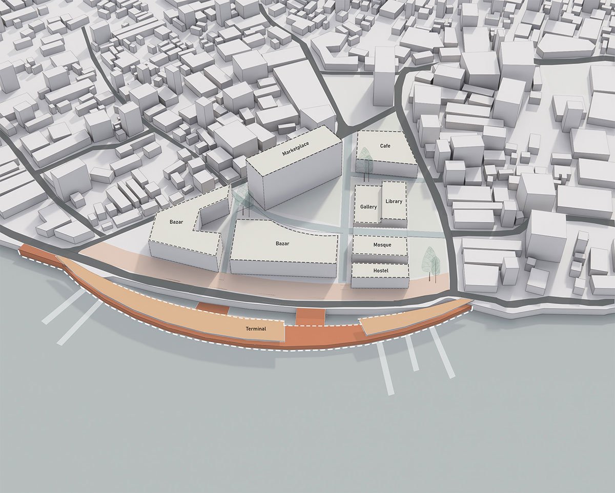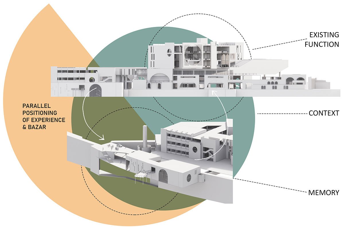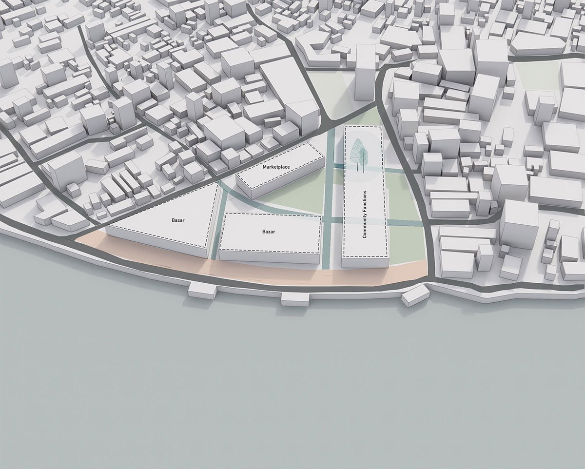 Its site, Zinzira Bazar, could not be demolished in order to construct a memorial considering it is still in use and supports the neighbourhood. Prioritising the urban context, the revival of the Bazar is part of an overall strategy in which neighbourhood involvement is strongly encouraged.