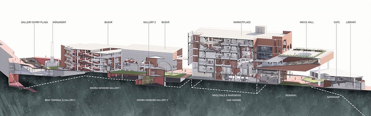 Conclusion: By creating a memorial journey that promotes peace between the past and the present, this project as a whole adds significance to the site’s history by reminding visitors of the Zinzira massacre. Additionally, the project supports the community and promotes interaction within the city by revitalising the existing functions on the site.