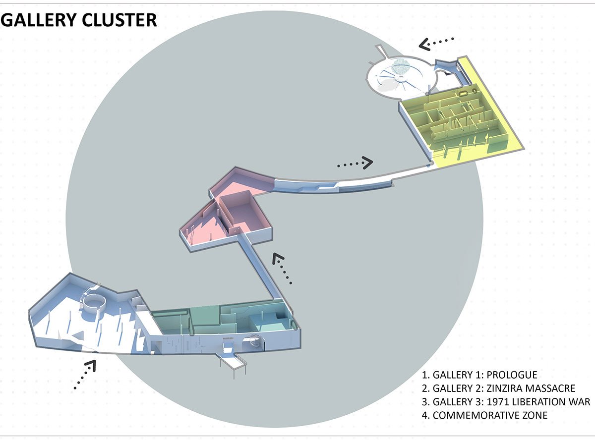 A significant portion of the experiential journey begins at the boat terminal’s -15′ plaza, which is also a part of Gallery 1. The concept behind Gallery 1 is the prologue to the Liberation War. Gallery 1 leads to Gallery 2, which is located at -15′ and -25′ levels beneath the conventional Bazar, respectively. This one is purely based on the 1971 Zinzira Massacre. A chair from one of the victim’s homes is displayed there along with other things as an exhibit. The third Gallery connects the café terrace and mosque with a block that includes a library and an experiential pathway.