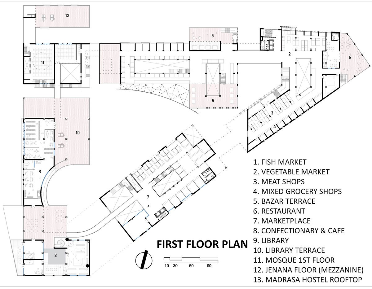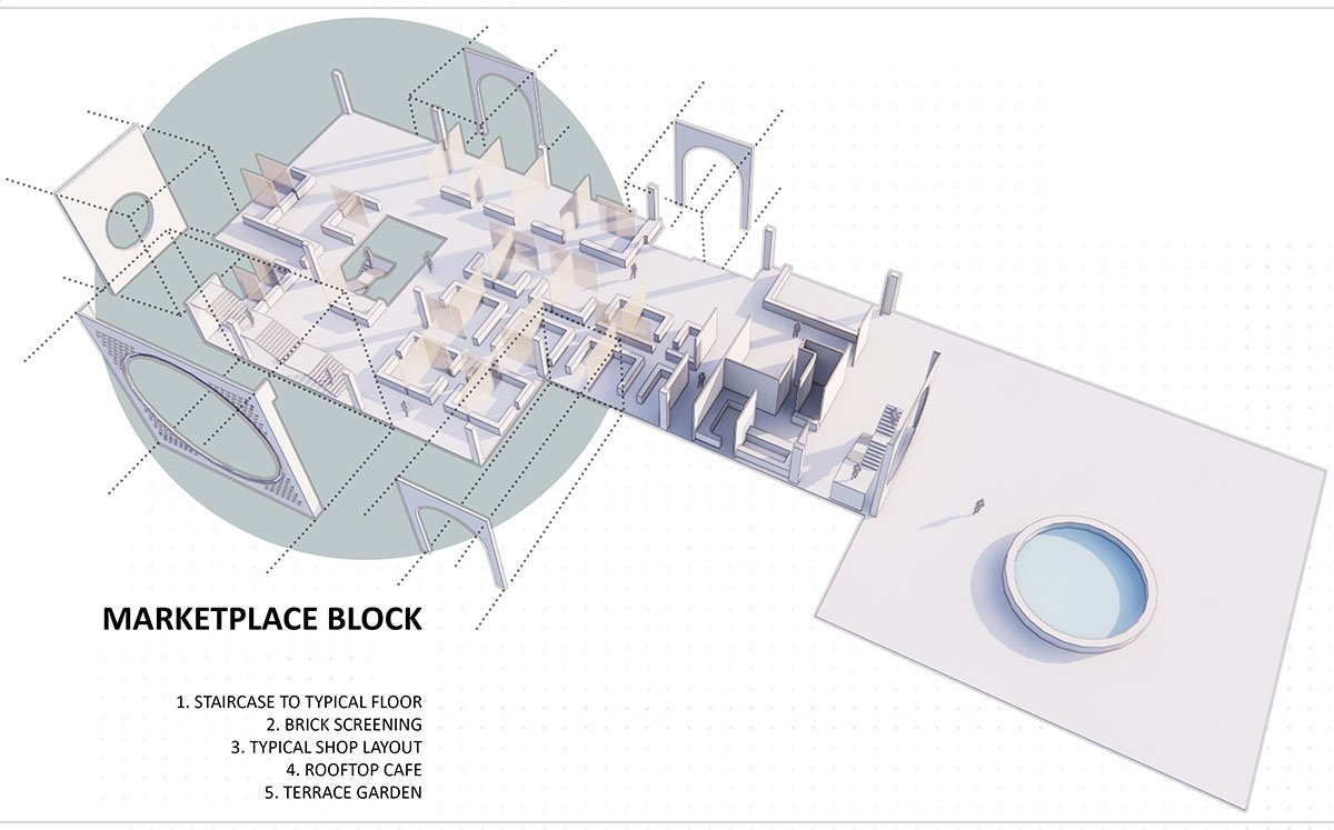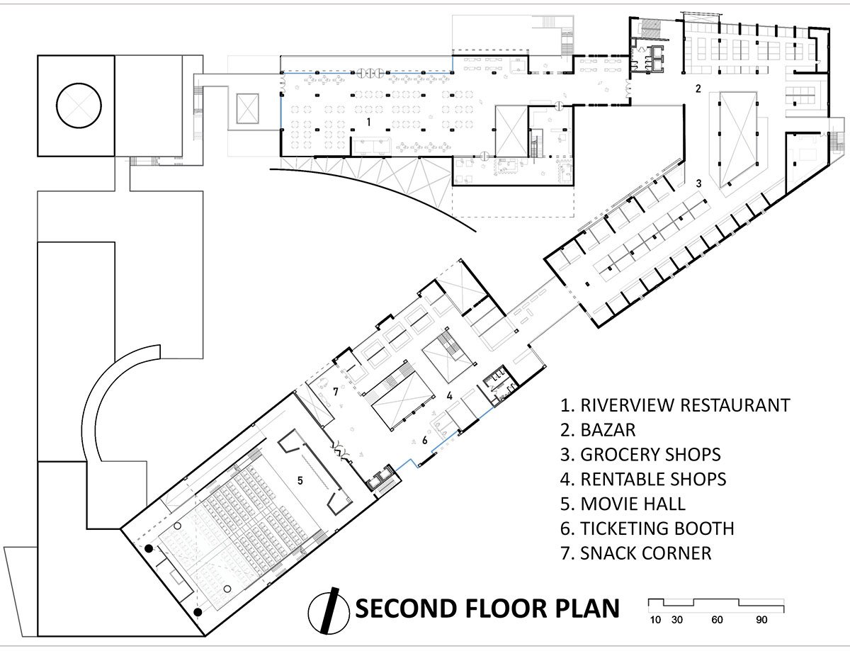 The marketplace is designed to house additional rentable shops, and the theatre has a terrace garden and a café on the roof. The library block is connected to a confectionery, café, and super-shop block. The project tends to serve not only inside a region or a locale but also enables and permits the neighbourhood and even the city to interact with it.