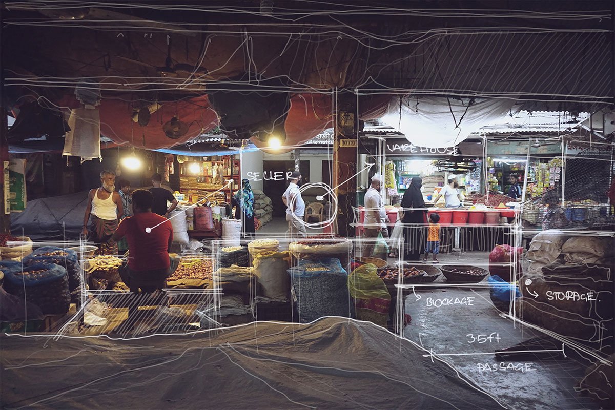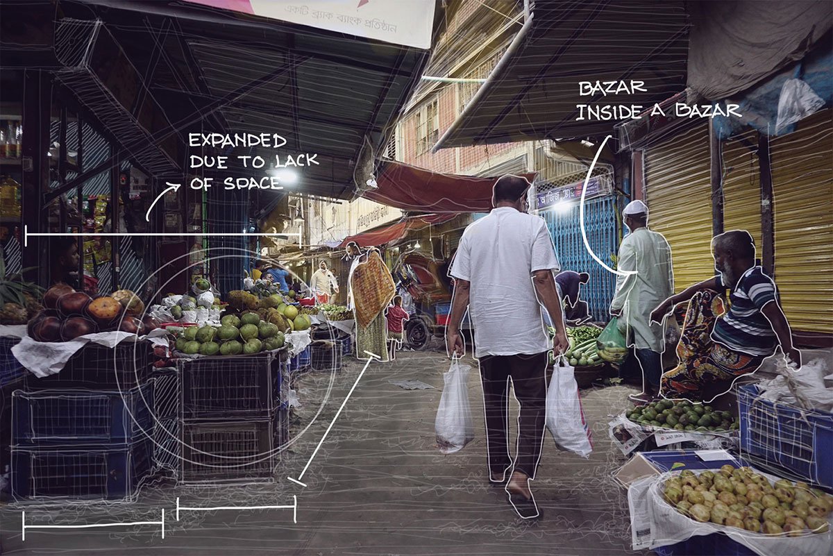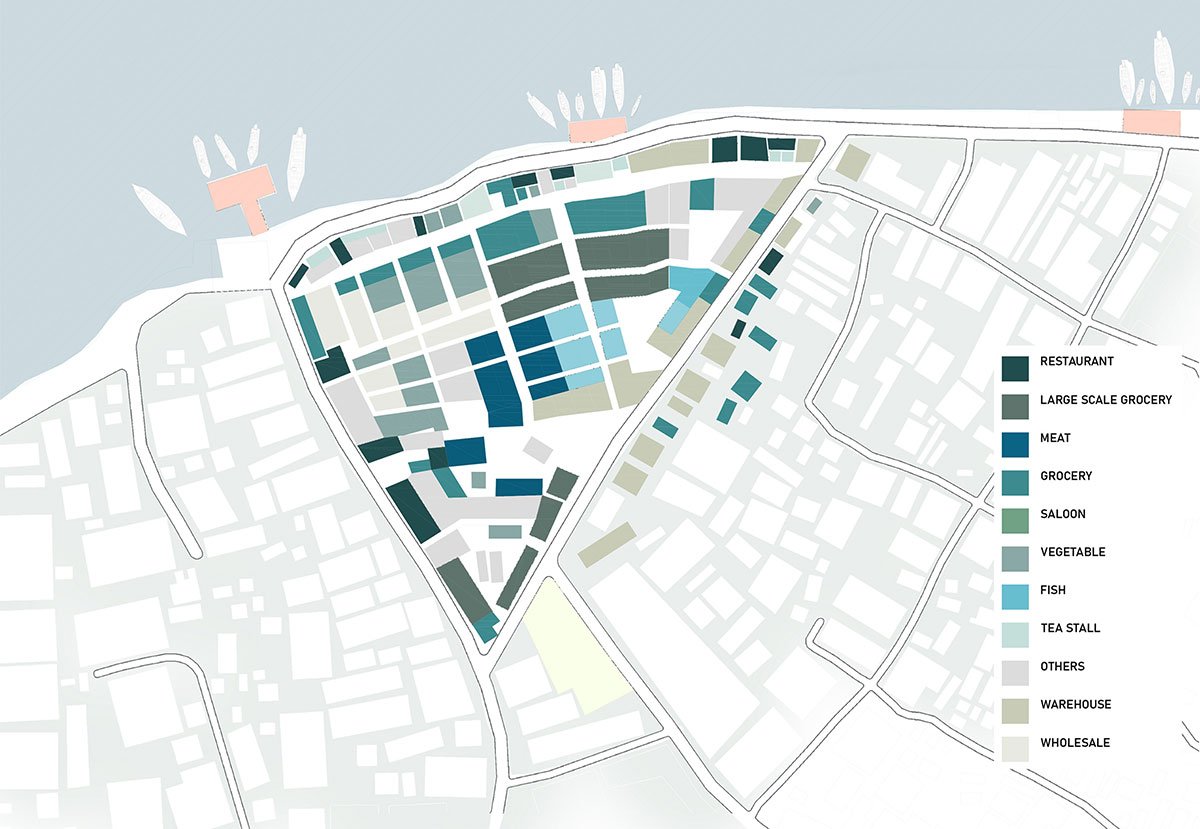 Currently, the site is home to restaurants, grocery stores, meat and vegetable markets, warehouses, and wholesale businesses. An existing ghaat serves as an informal social space where illegal occupancy also takes place. The bazaar’s current unorganised retail areas and expanded shops with limited space have resulted in narrow pathways.