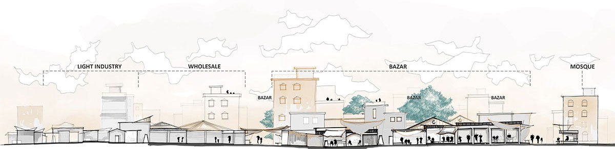 The traditional bazaar was remodelled with some amenities and separated into various zones to increase its effectiveness. The wholesale setup and warehouse have been relocated to basement level 1 at -15′, where there will also be a loading dock for mass transit.