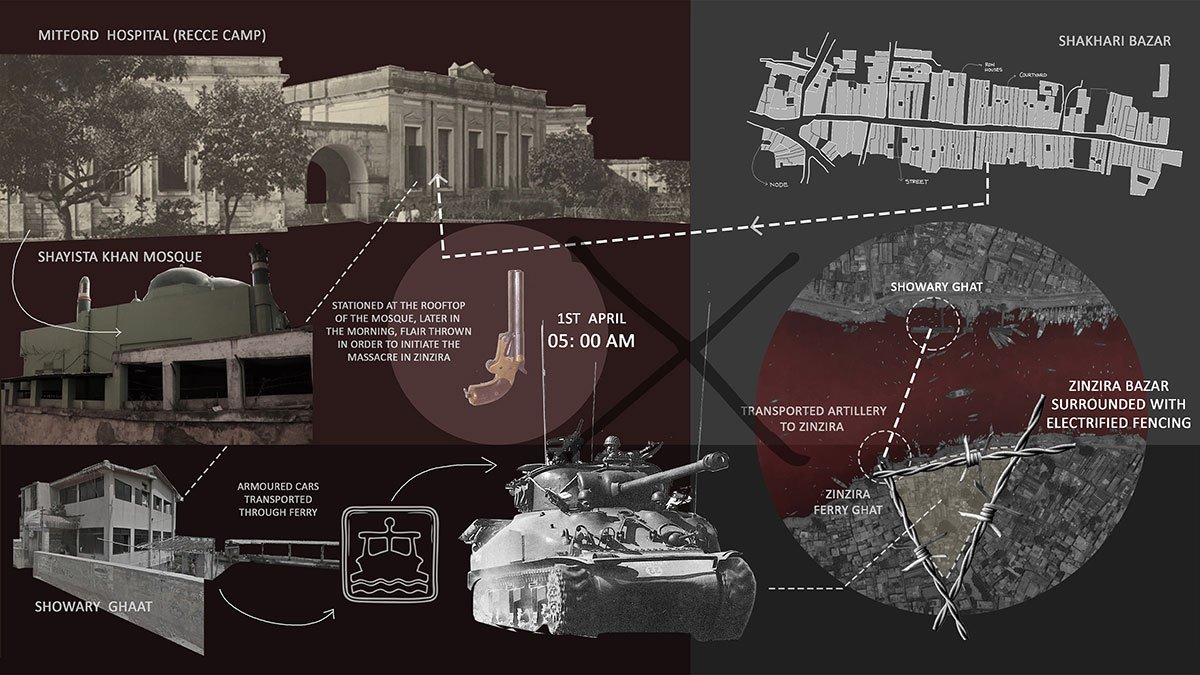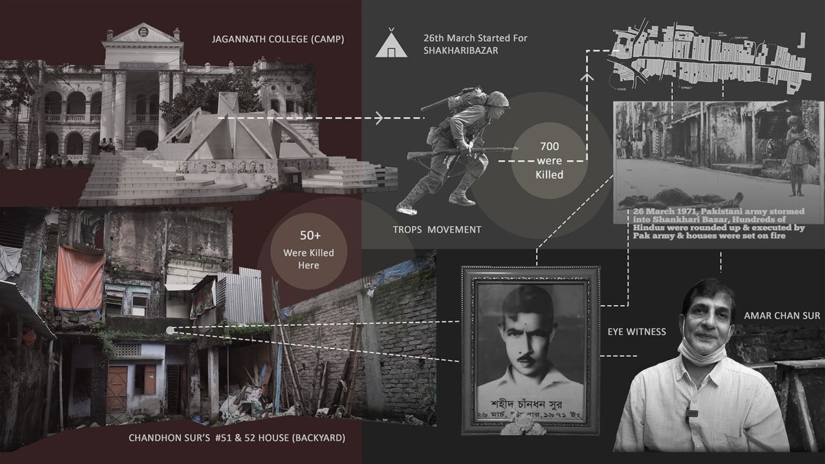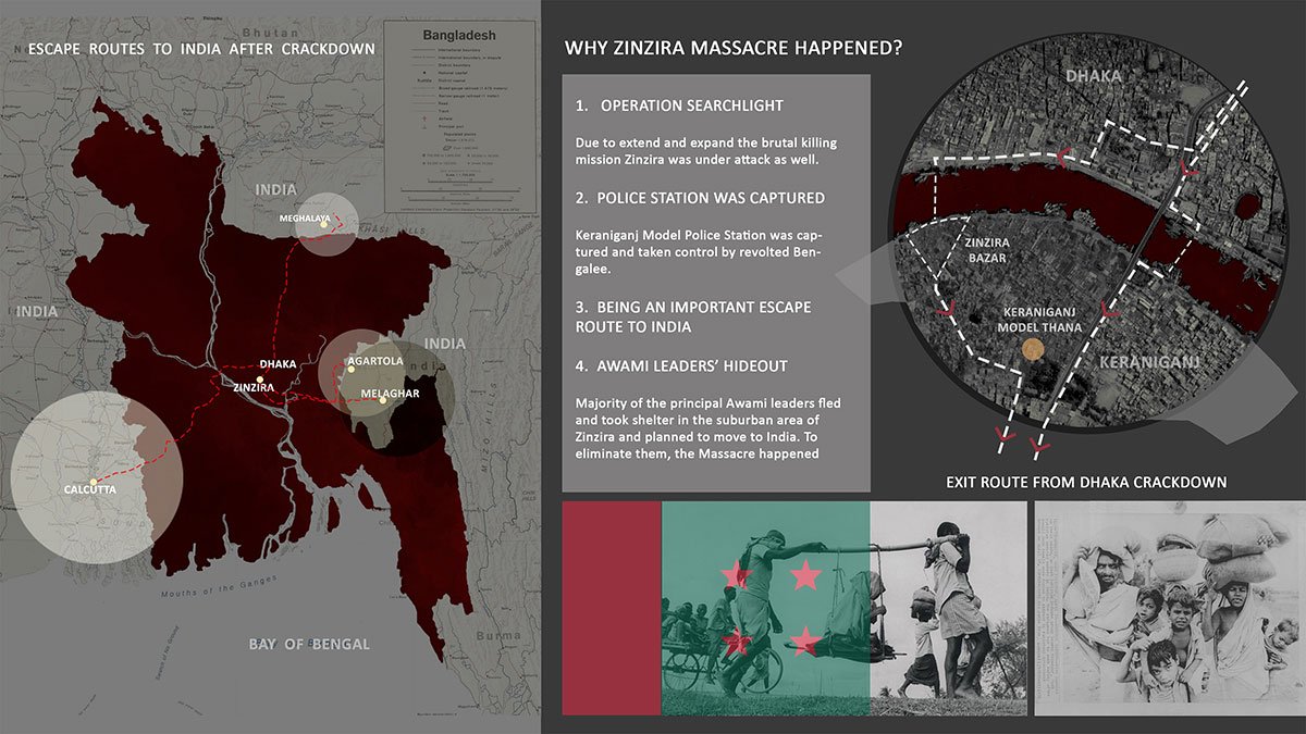 Introduction: The genocide that murdered three million people in Bangladesh during the independence war in 1971 is still not recognised widely. In a systematic killing spree, the Pakistani militants and their local allies murdered victims and discarded their dead bodies either at the killing site or in separate mass graves. These killing sites are spread out across the nation. Unfortunately, there was very little visual evidence of these atrocities because famous local reporters were killed or forced to flee the area just after the crackdown, and foreign journalists and reporters were expelled from the nation just before the massacre. Only a few significant mass graves were preserved, protected, and designated as historical sites when the country attained independence. The site of the Zinzira massacre is rediscovered through this research, leading to the development of a memorial journey that encourages harmony between the present and the past.