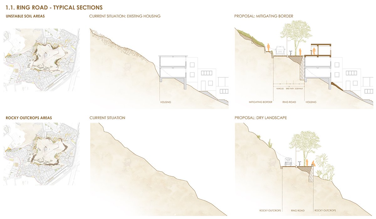 1- Improving accessibility – A mid-slope ring is proposed to contain urban growth and link the existing urban fabric. This system introduces new public transport options, including an intermediate station connected to the planned cable car, road access from major avenues, and a continuous bike path.