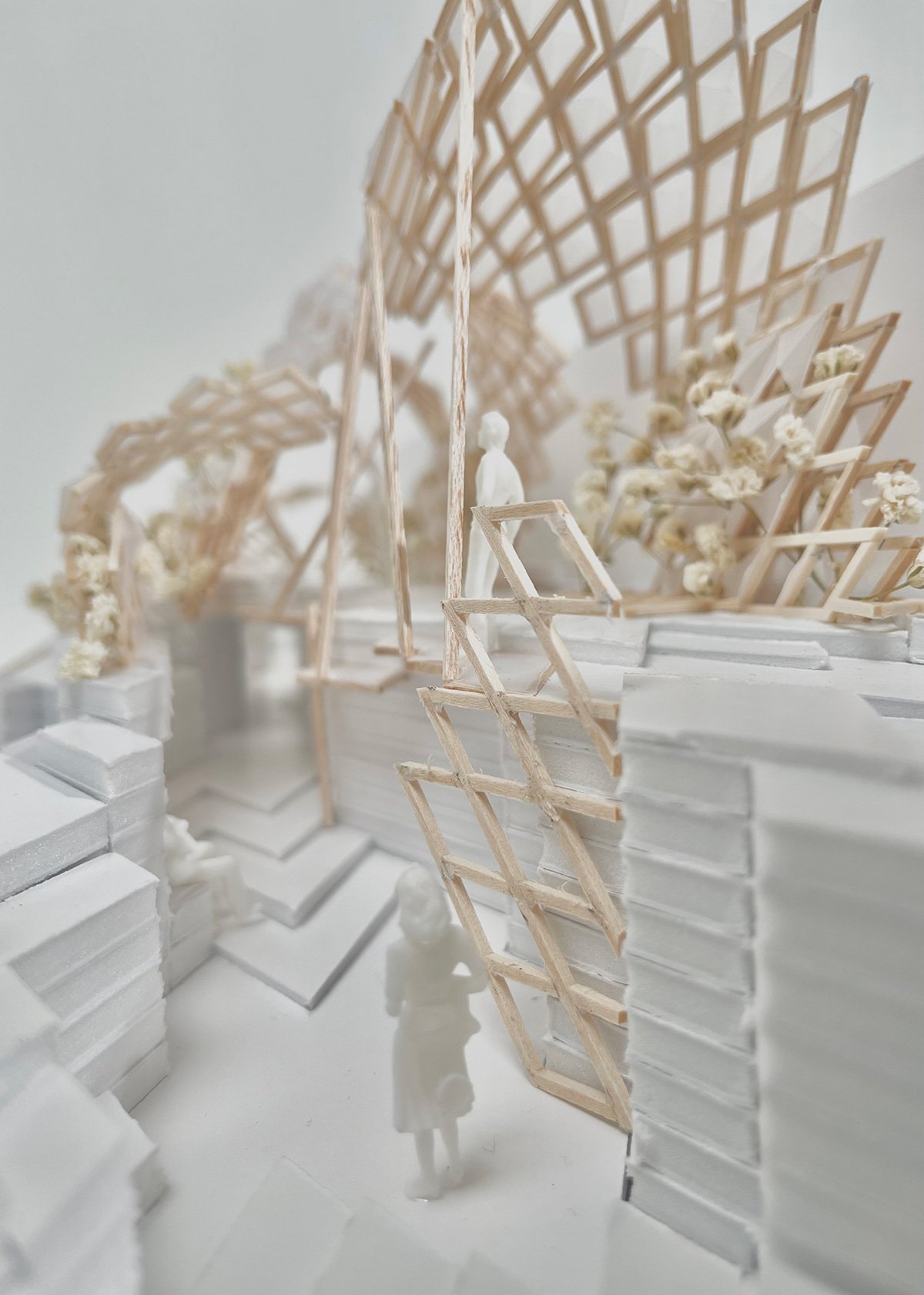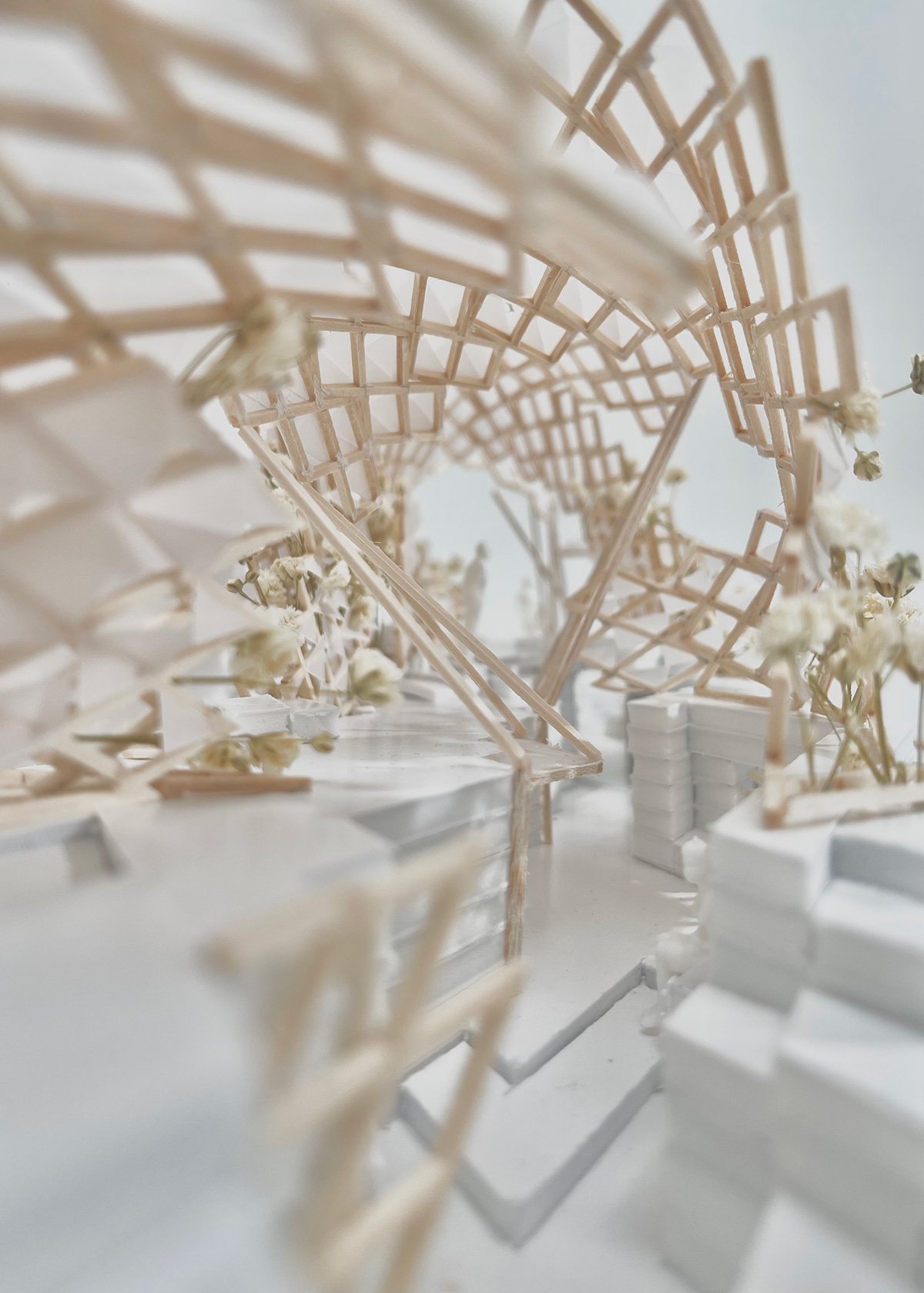 The site was documented through a process of data analysis and observation. The existing plant life on the site was dense and highly resilient to the harsh weather and dry conditions. The decibel readings on noise pollution were significantly lower when standing behind these planted regions, resulting in the use of dense plants such as Hedera Ivy or a Climbing Hydrangea in the design. The octahedron shape of the panels were contrived from existing geometries on the site; however, it does not intend to replicate the same visual environment. The shells are made of wood, each panel from a translucent glass that shields the interior from harsh sites of the junkyard, bathing the interior with a soft indirect glow. The panels connect in systems of seven and hinge to generate a gentle curve. They layer organically, the geometry of architecture undoubted, yet somewhat ambiguous in its border with nature. The double panelling on the shell walls hosts plant growth within the vessel, responding to the effective conditions observed. The growth and said effectiveness, however, are left to the unpredictability of nature.