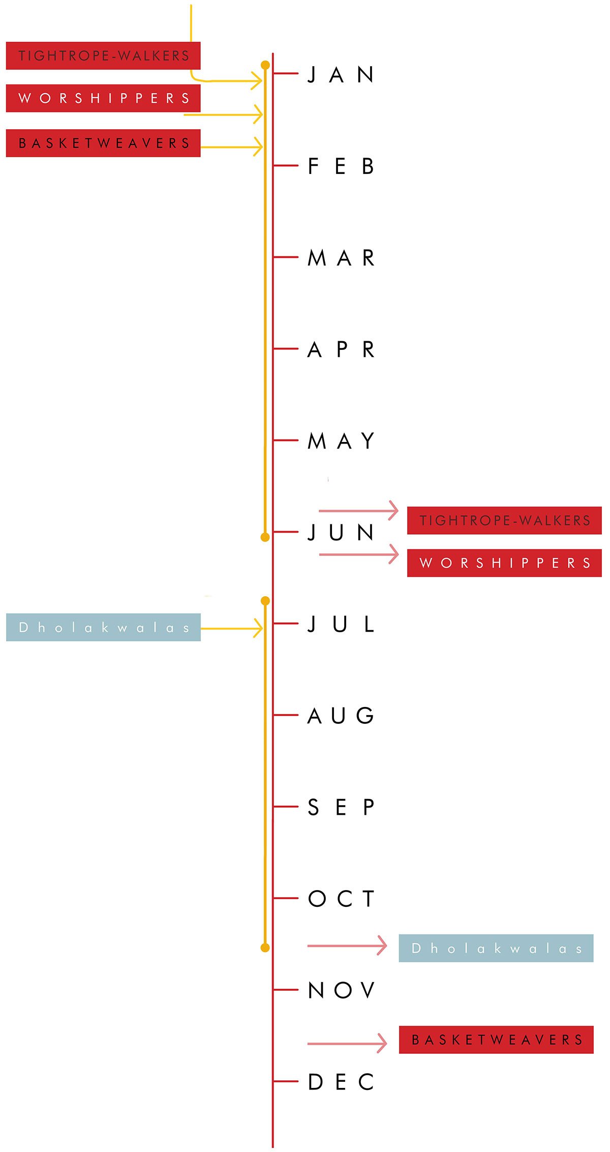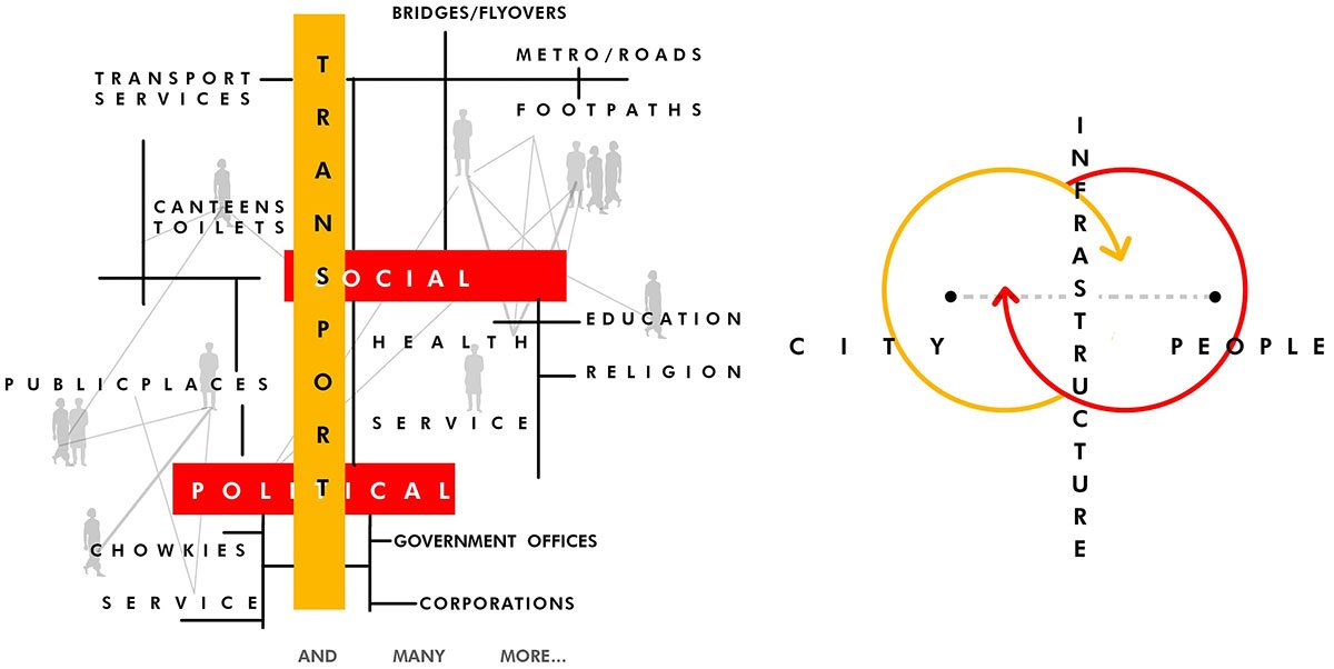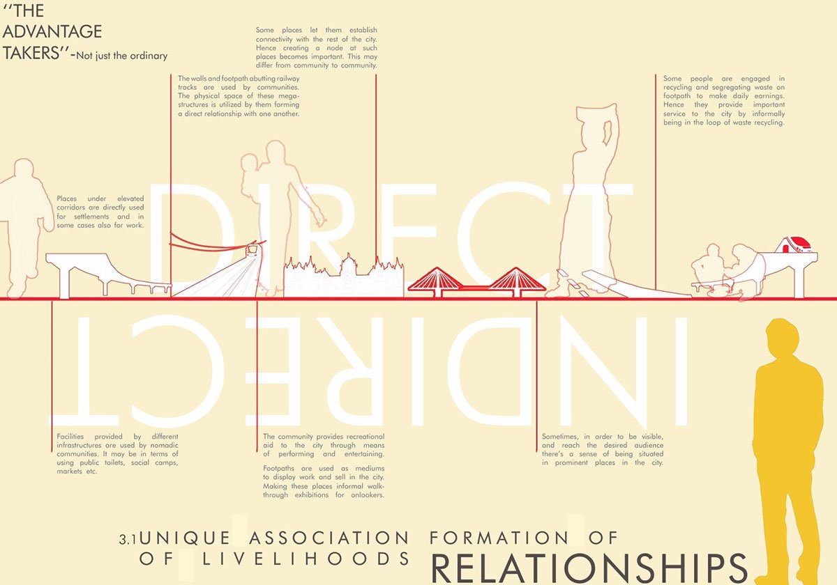 These communities are often seen using the city’s various infrastructures for purposes other than those for which they were intended. Observations include railway stations, the undersides of flyovers serving as shelter, streets serving as marketplaces or exhibition areas for their products, roadside learning serving as a permanent form of schooling, etc. Surprisingly, these communities not only pursue their self interests but also support the vitality of the city by providing services like informal recycling, entertainment, leisure, and the formation of commercial chains. Strategic livelihood linkages form a symbiotic relationship with Mumbai’s urban fabric.