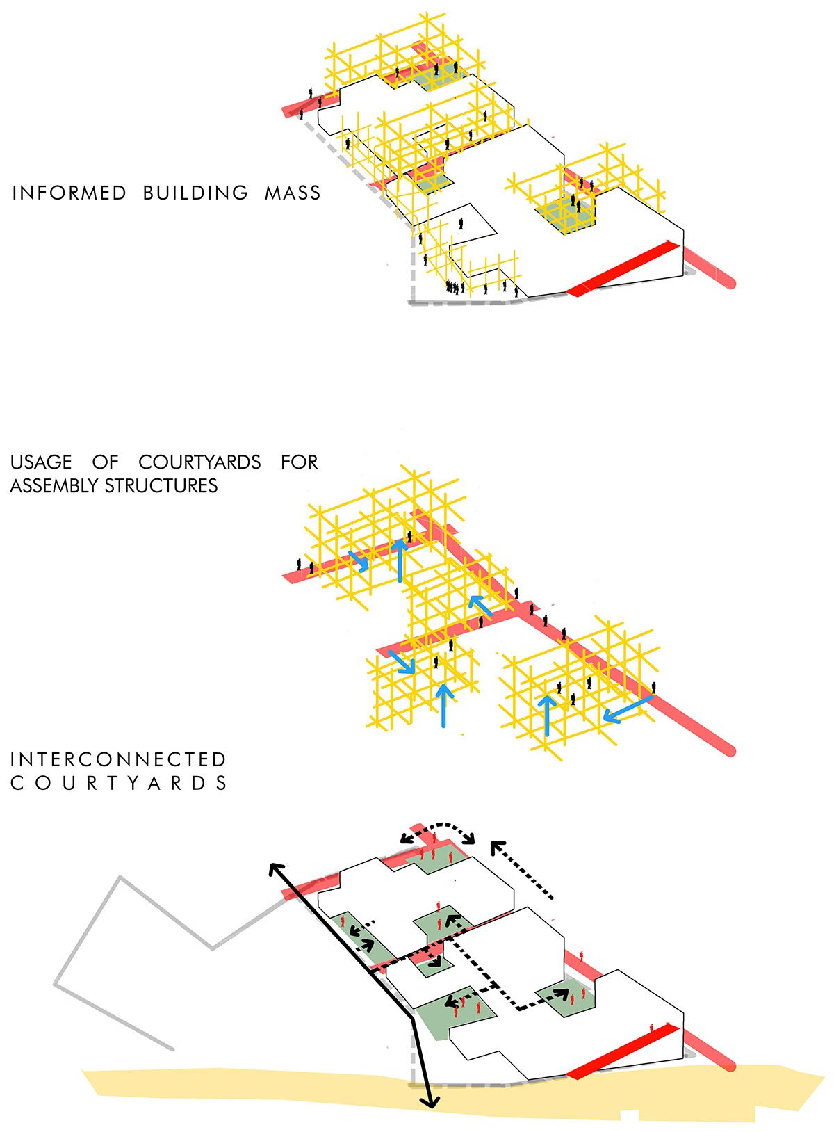 The Design Intent: In order to accommodate nomadic communities that visit the city on a seasonal basis, the design attempts to create a flexible space for emergencies and special needs. It can be expanded to accommodate housing, camps, and rescue shelters in addition to serving as a workspace, display area, and night shelter.