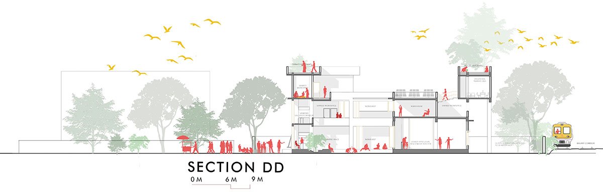 Internal conversions, like folding partitions, maximize space utilization, comfort, and user preferences. Through plug-in programmes run by NGOs, participants can use their existing skills and pick up new ones in this building. These initiatives support the shelter’s broad concept by providing crash courses, subsidised benefits, and facilitated buying-selling relationships within the building.