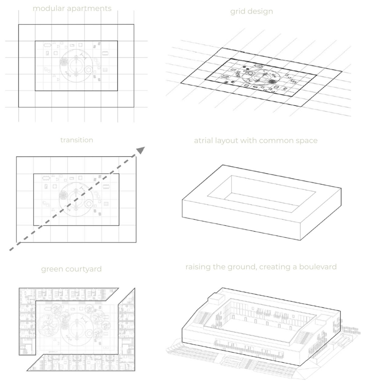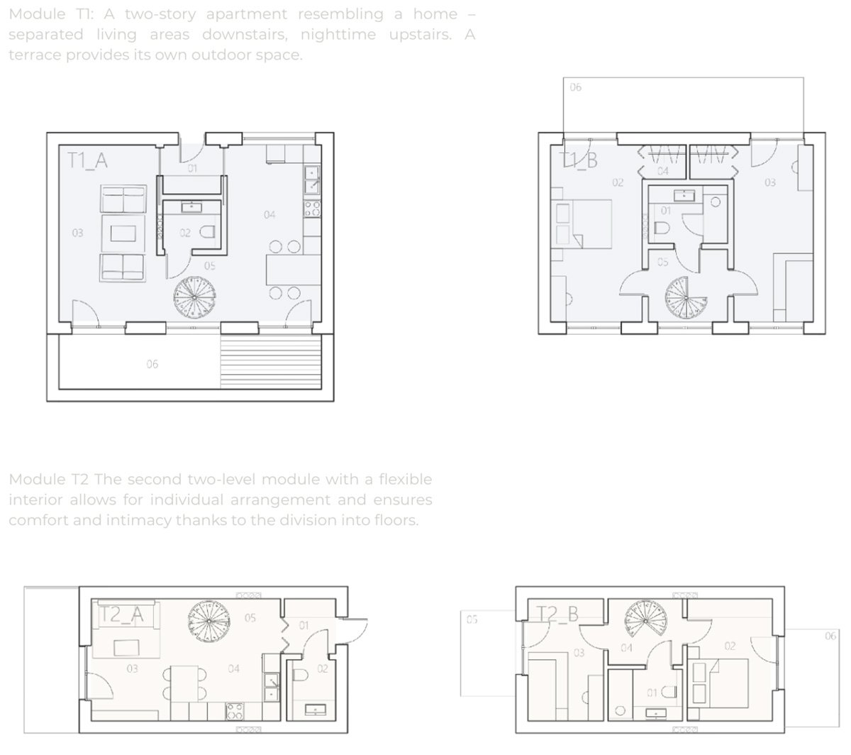 Shaping the building’s plan and mass | Apartment layouts – two-story modules.Apartment layouts – remaining modules.