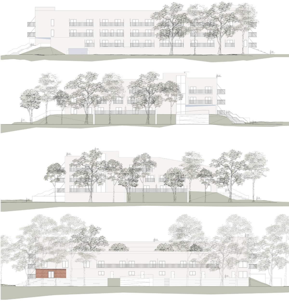 The design process began with an analysis of urban relationships and patterns of use in the surroundings—pedestrian routes, building scale, and potential neighbourhood connections. In the first phase, multiple massing variants and layout schemes were developed, testing different ways of daylighting the apartments and organising circulation. A key moment was the move away from a conventional stair-core layout towards a building with an internal green courtyard as a space that both integrates residents and structures the plan.