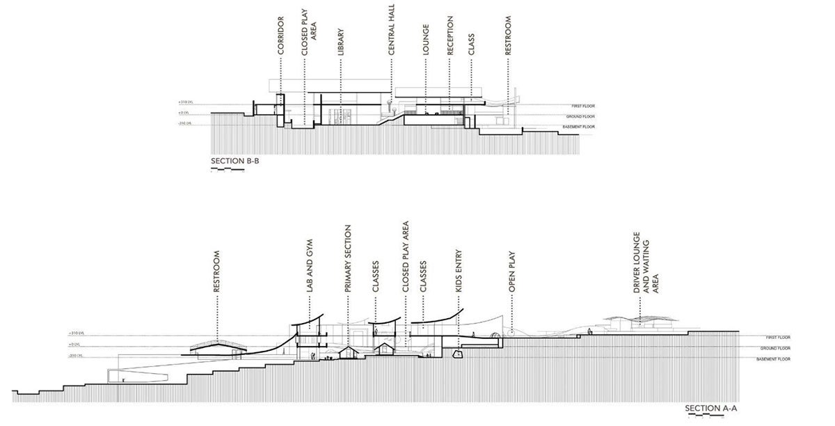 The upper-grade classrooms are located on the first floor and provide a disciplined learning environment that is interspersed with play. Labs offer chances for both practical skill development and scientific study. Corridors overlook lower levels, encouraging curiosity and discovery of creative activities in triple-height workshops. Spring Valley School’s educational experience is enhanced by the design, which skillfully combines learning, play, and engagement with the natural environment.