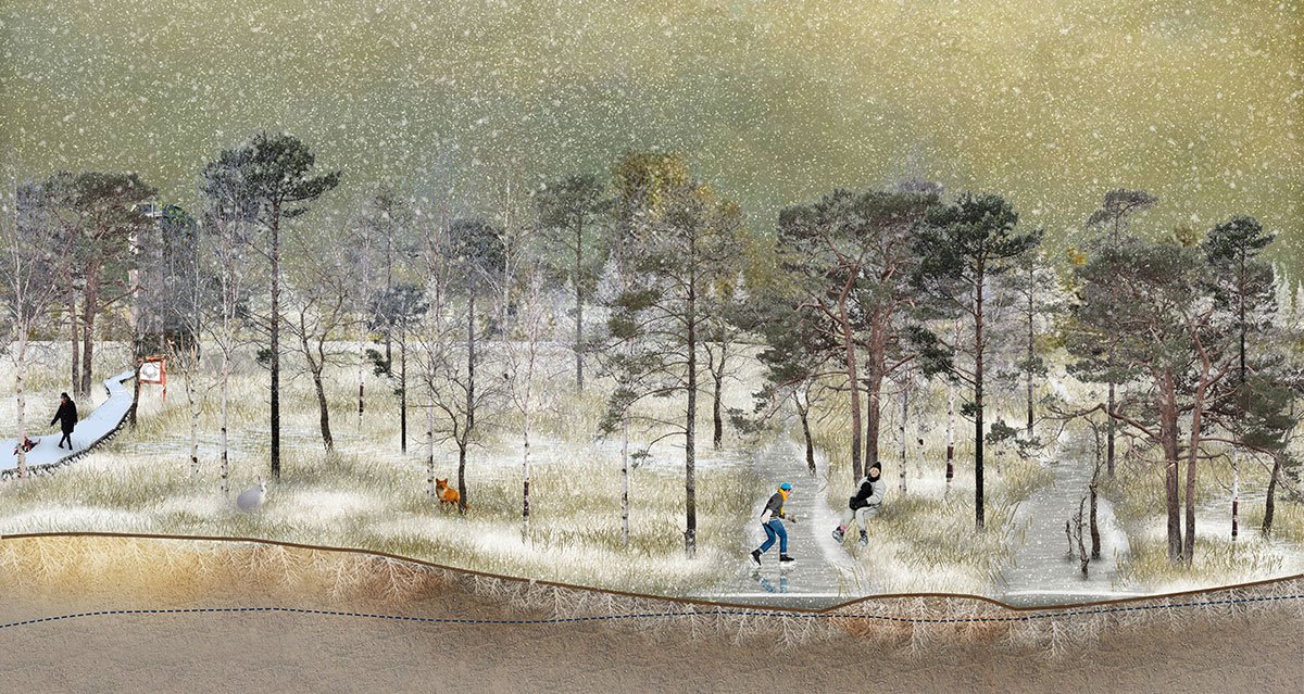 The Palimpsest of Peatlands transforms the existing template for nature reserves in Russia into a new national park on the outskirts of St Petersburg, where nature and people can co-exist. After centuries of exploitation, a renaturation strategy is implemented to restore the peatlands. Parts of the cultivated swamp are made inaccessible to humans through flooding. Over a period of 80 years, the raster of ditches gradually transforms as the nature of the swamp changes with the restoration of the water table. This dynamic process creates a variety of swamp types, each with its distinct biosphere.