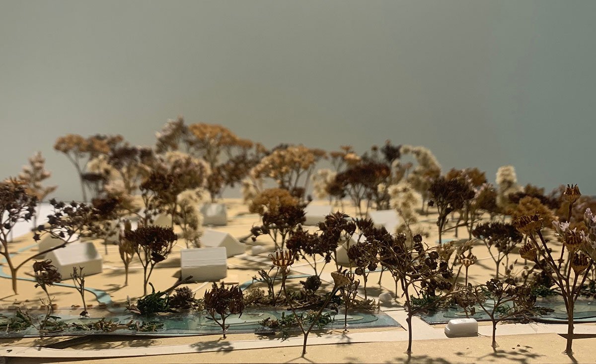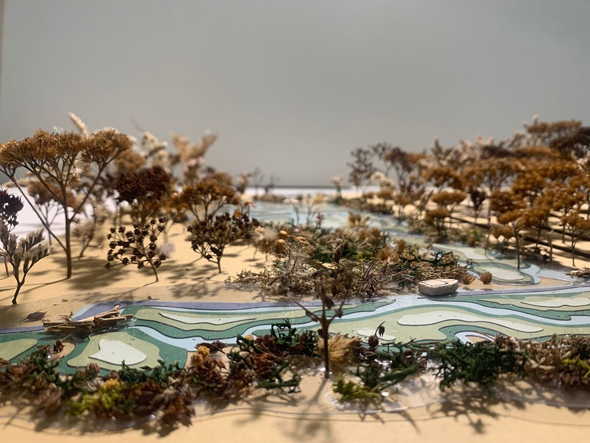 Masterplan of the site in 80 years representing the evolution of the swamp landscapes and the various routes through the nature reserve.Entrance into the nature reserve from the city (the east side of the site).