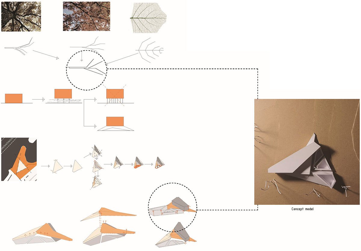 The irregular lines of tree branches and leaf veins served as inspiration for the building’s form, which was derived from the surrounding natural environment. In order to withstand harsh floods, the building mass was elevated on a slope. With the aim of establishing connections with the surrounding nature, a triangular layout was adapted and variations in volume aided in providing beautiful views from the building.