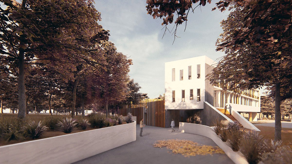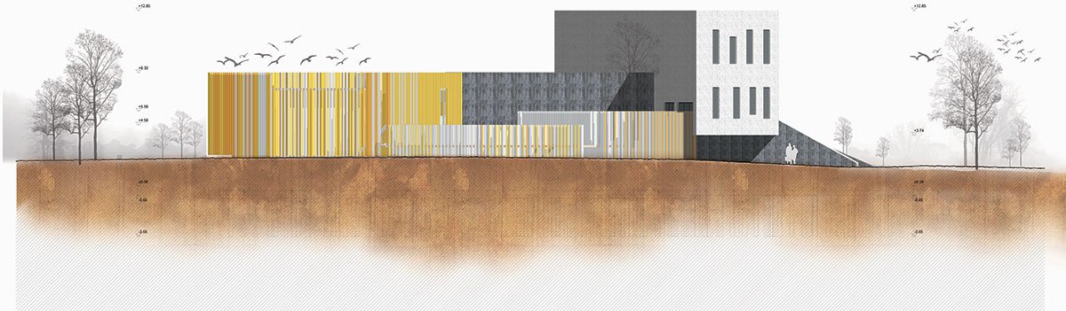 To reduce its visual impact, the building rises softly from the earth and blends in with the surroundings. In addition to being ecologically friendly, this design strategy is especially well-suited for construction in flood-prone areas. Because of the site’s level, and low terrain, the building has a commanding presence; it resembles a mountain and offers a stable haven for birds.
