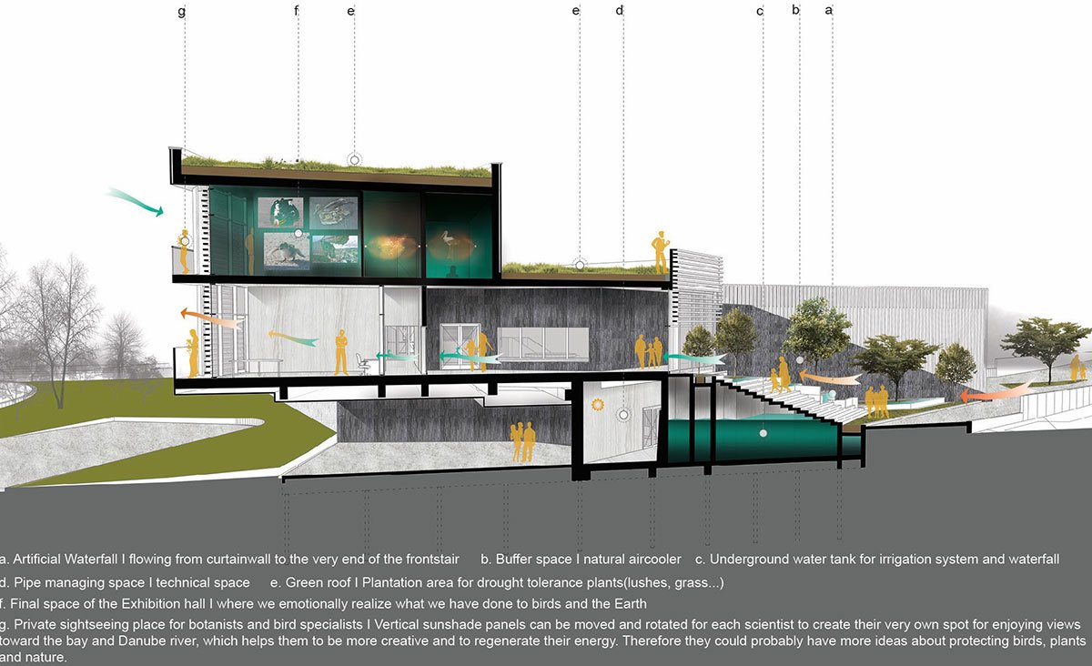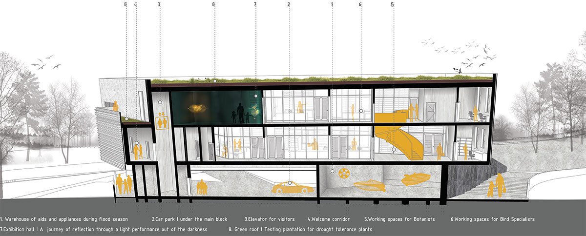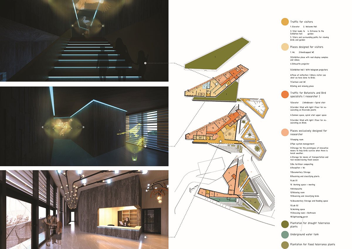Conclusion: This project uses architecture to try to accomplish its two primary objectives of raising public awareness about the importance of conserving riverbank vegetation and birds and restoring the ecosystem to reestablish the links in the food chain.