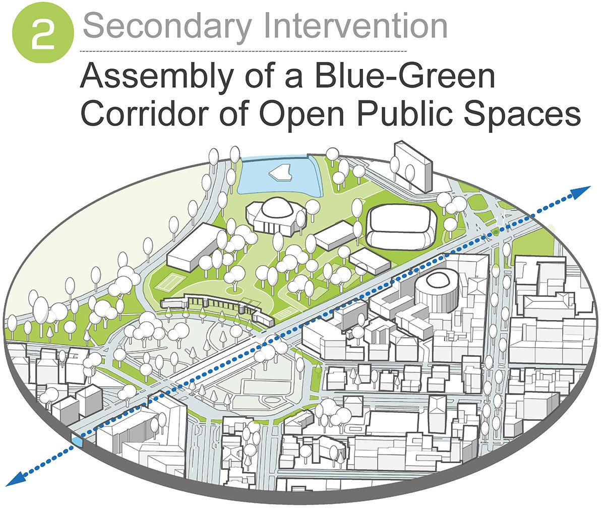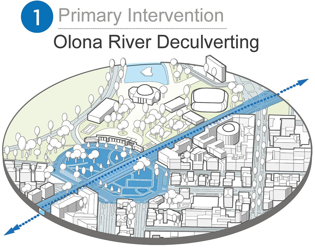 Primary intervention -The Olona River Deculverting, Secondary intervention – Assembly of a Blue-Green corridor of open public spacesFour drivers for the assembly of the new Upside Down Flows