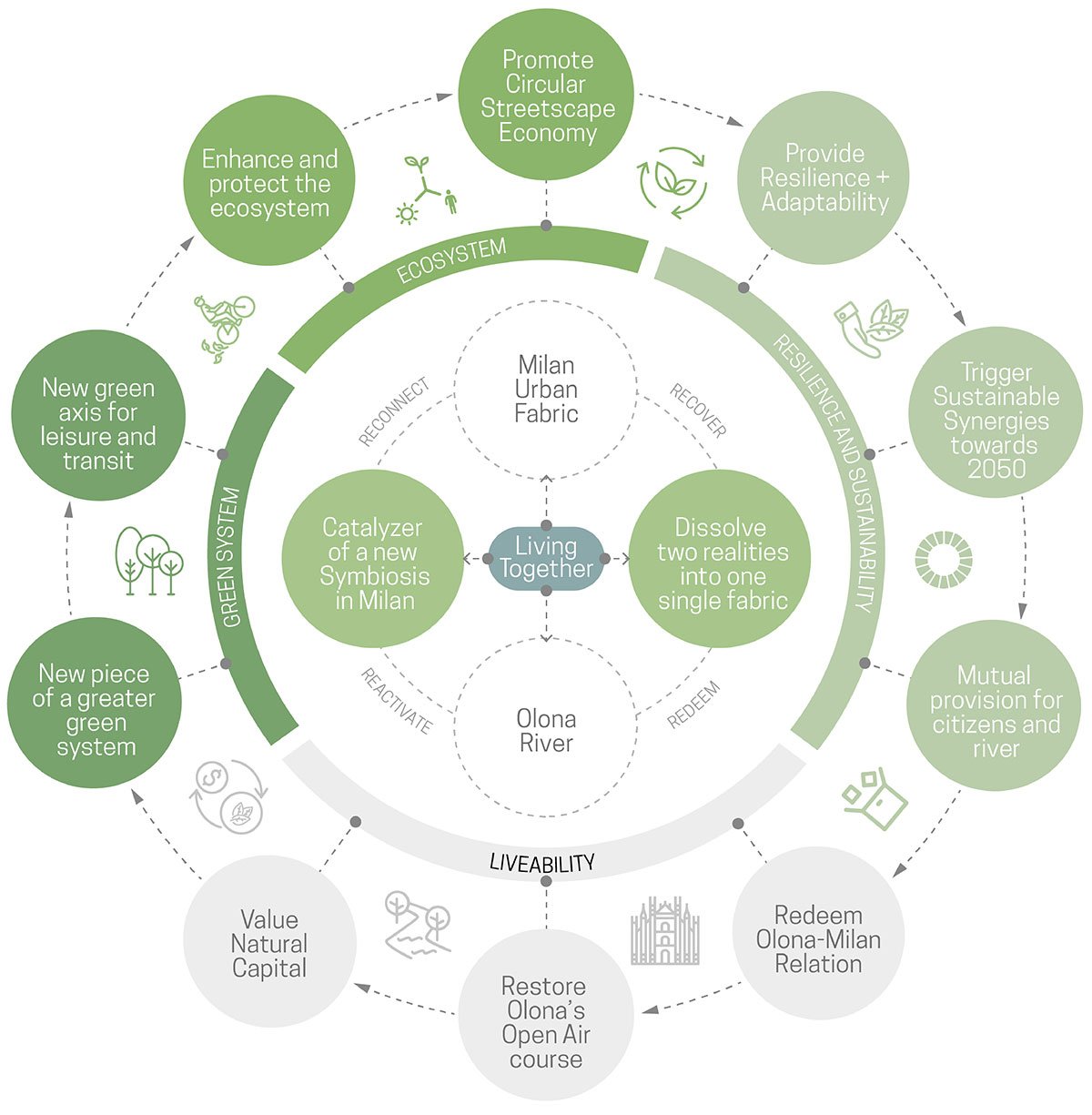 The Olona River manifests itself as a palimpsest, fusing the ‘upside‘ built fabric with the ‘downside‘ lost water landscapes, creating an experimental path to a human-landscape redemption along the public realm, acting as a catalyst for the addition of resilient green public spaces, and providing an array of ecosystem services that mitigate the current climate crisis and enhance green and sustainable strategies in Milan by 2050. This is made possible by the multidisciplinary participation of stakeholders at all levels, from municipal and regional boundaries to national and European levels, resulting in inclusive, equitable, and accessible spaces that support the needs and priorities of the community, add value, and boost neighbour and citizen ownership and identity.