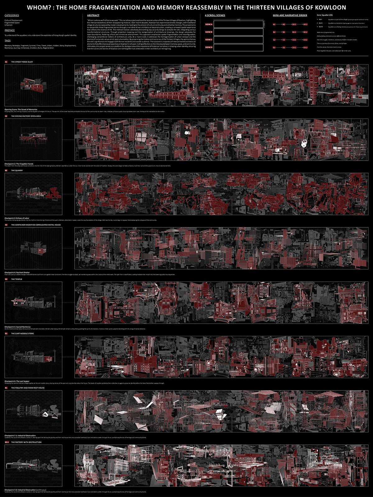Introduction: “Whom is where we find the home we seek.” This narrative project reimagines the Thirteen Villages of Kowloon, highlighting their disappearing histories through architectural deconstruction. As traditional village spaces vanish under urban renewal, cultural memory and identity erode. By dismantling and reassembling “low-value structures,” the project creates a fragmented yet emotional spatial experience. Suggested with projection mapping and transformed architectural drawings, they evoke memory, emphasizing fluid boundaries and immersive storytelling. This approach critiques the homogenization of urban space and the loss of human connection. Rather than replicating the villages, the project honors their often-overlooked details such as bricks, grills, and rhythms, thereby preserving these fragments as integral elements of living narratives. It invites reflection on memory, place, and belonging, offering a dialogue between past and future. Through this, Kowloon’s stories remain visible, resonant, and shared.