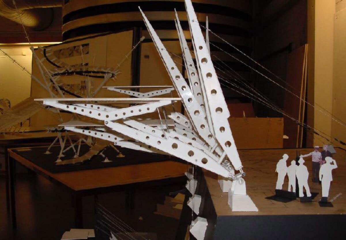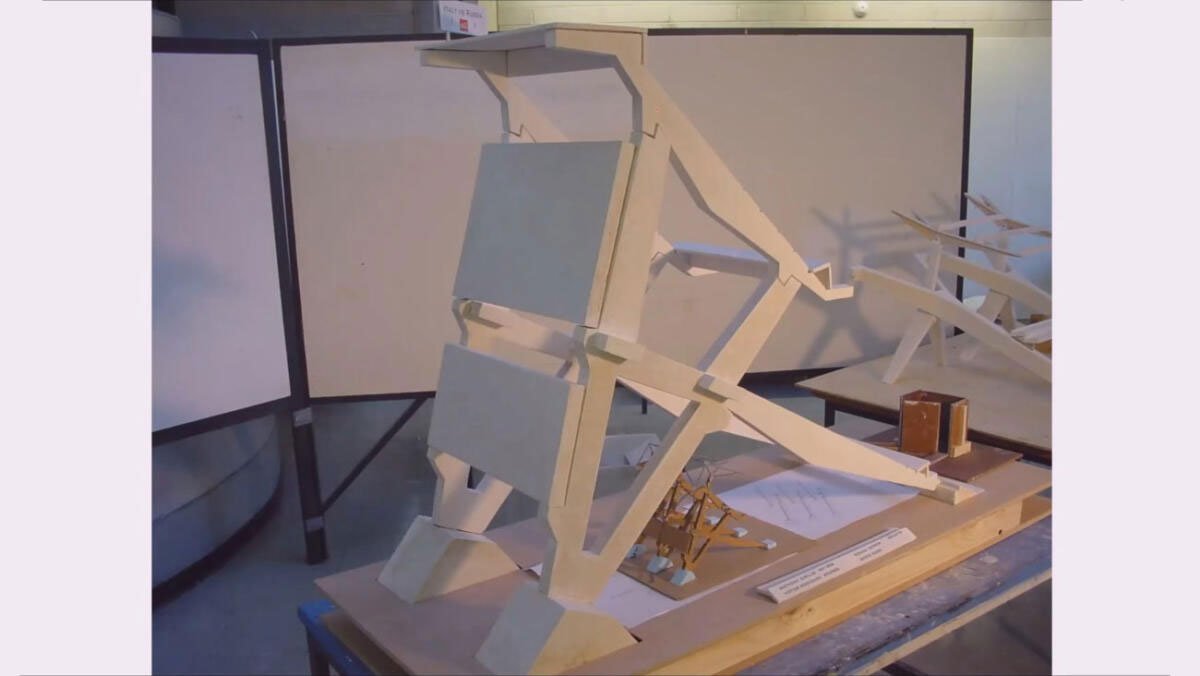 He shows examples of student works, where a topic such as surfboard or a ballet dancer is interpreted abstractly. First ‘half’ of the studio is focused on developing certain abstract ideas from the selected topic into a three dimensional form. This part allows students to do an exploration – free leap – without getting worried about structure or functions. The second ‘half’ of design studio is focused on applying appropriate structural system, and materials to develop the form by making a series of process models. These process models simulate the forces in the structural system, and are often tested to the point of failure, in order to arrive at the final form. This method of moving from abstract to reality pushes a designer to think unconventionally and lead to a better understanding of structure and their forces.