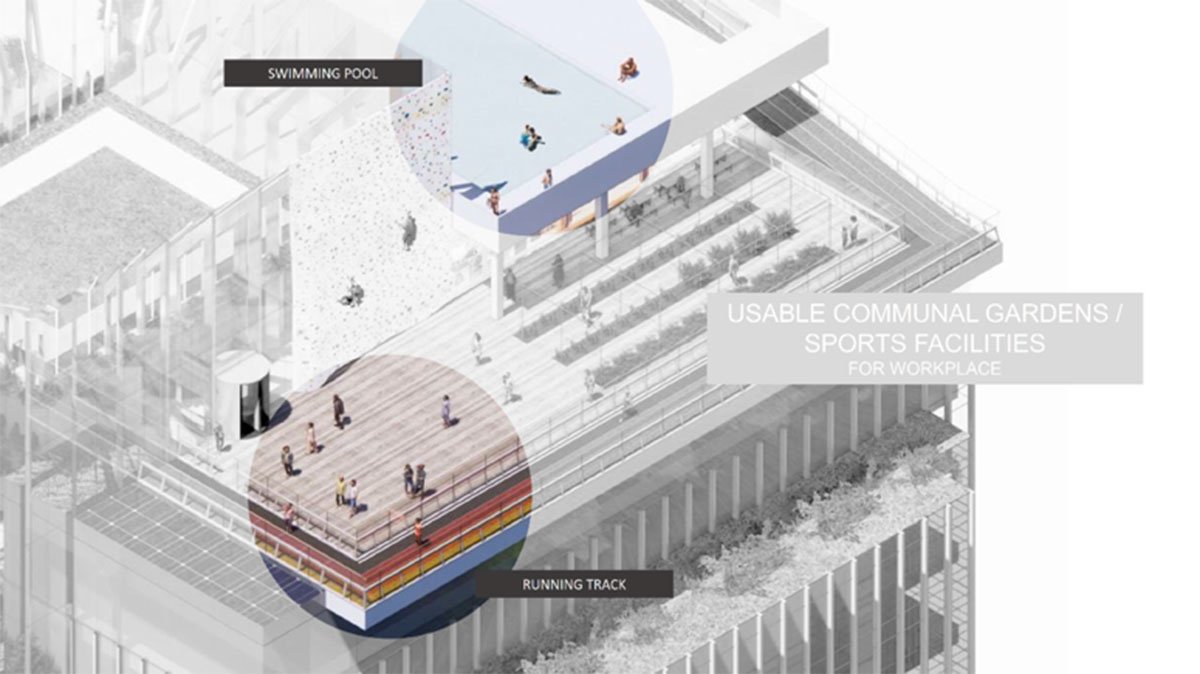 Future workplaces will not only support the economic needs of companies, but also the mental and physical needs of employees. Mindplace will allow workers to use their time more flexibly to increase productivity, making numerous on-site amenities available. These may include health clubs, yoga studios, rooftop running trails, swimming pools, and even public gardens that promote relaxation, conversation and collaboration.