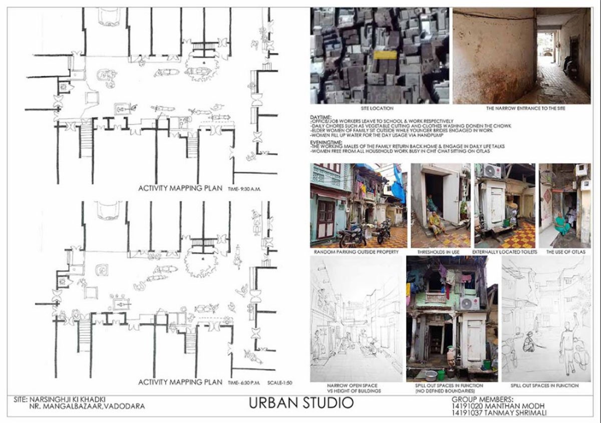 In the groups of four, students were asked to identify five open spaces from within the old city of Vadodara. These five spaces should possibly cover different scales from the entire city; starting from the smallest open space between two/three houses to the large open spaces meant for the entire city.