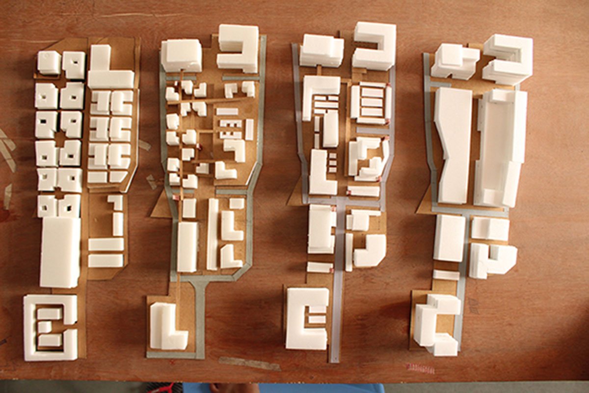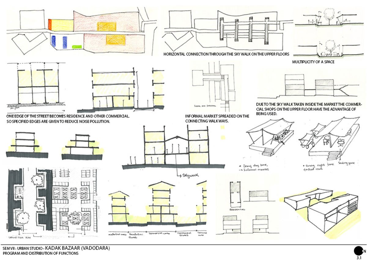 After having done the case-studies and the site-analysis, students were divided in the groups of five. The first part of the design process dealt with five points identified in the ‘theme’: Program, Distribution of Program, Vehicular and pedestrian network, Urban open spaces, and Urban edges. Each student in the group picked one topic and worked out detailed strategies for the same.