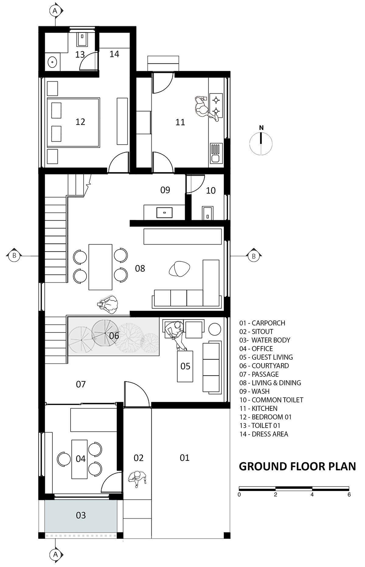 On entering the house, one is welcomed by an internal courtyard whose prolific green foliage is bathed with natural light from the overhead skylight feature. This miniature green strip provides the emotive focus, visually connecting the entry to the living room and dining space. The street facing office room in the front portion of the house is kept private by giving a separate entrance from the sit-out.