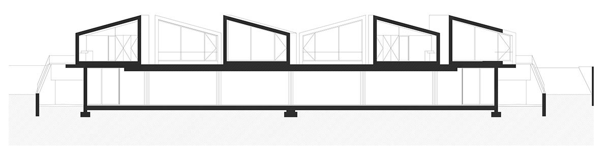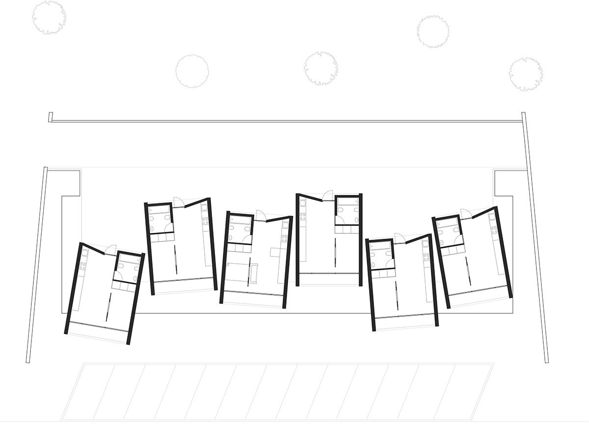 The strategy was clear: a ground floor level for the multi-services program connected with the public space, crowned by the individual habitational units (six cabins with 45m2). Due to the differences between these two programs, it was created an independent access for each one, placing them in different levels and taking advantage of the natural ground’s slope.