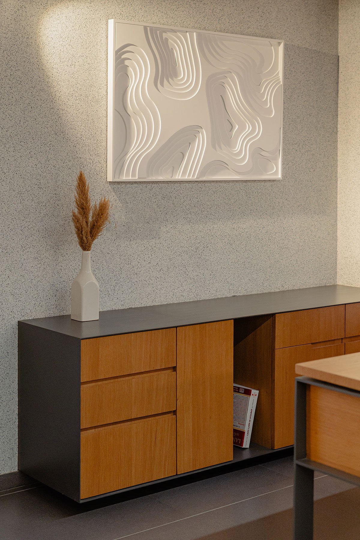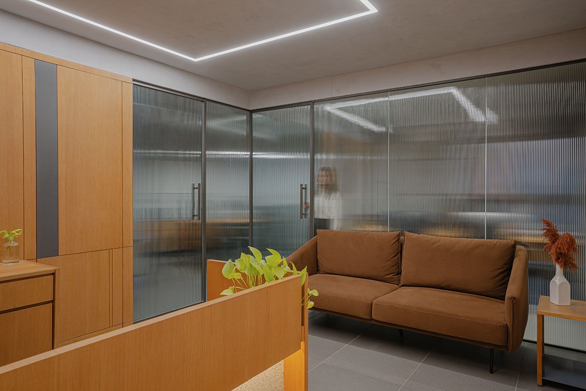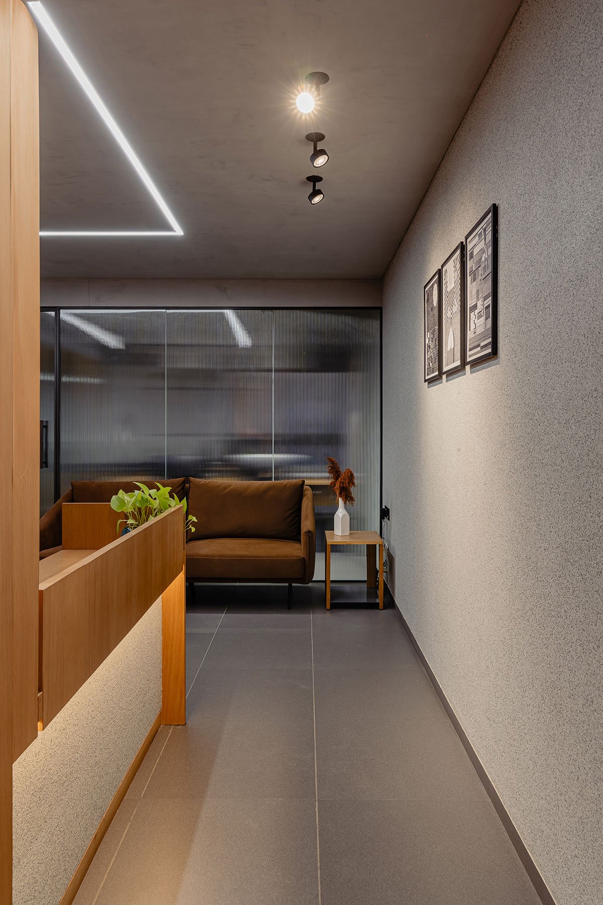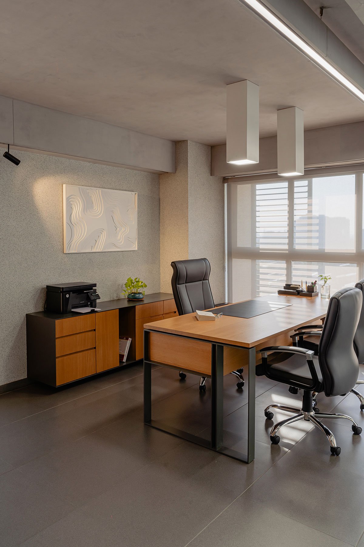 The design harmoniously integrates these elements to create an environment that not only meets functional needs but also communicates the essence and values of the client’s profession via thoughtful details.