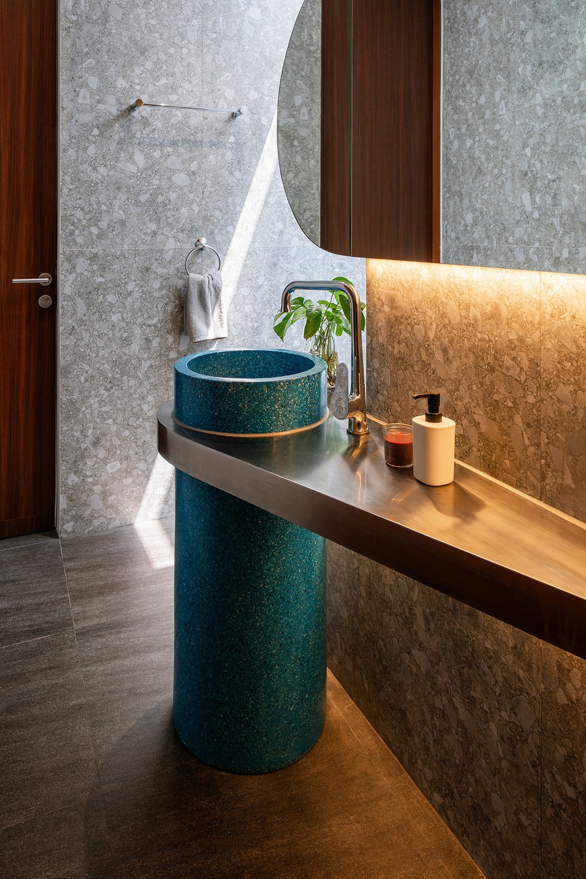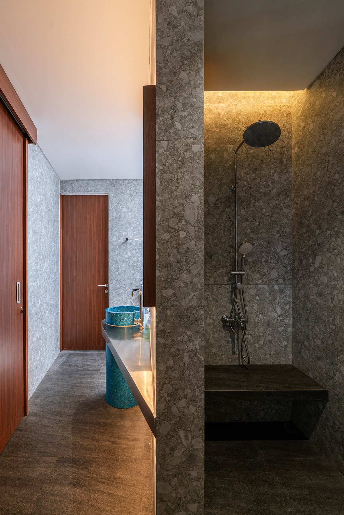 The private areas of the house maintain the same attention to detail. The bathroom, for instance, juxtaposes cool gray stone surfaces with a bold turquoise cylindrical basin—an artistic gesture that enlivens the restrained palette. Indirect lighting enhances spatial depth and accentuates textures, transforming utilitarian zones into serene retreats.