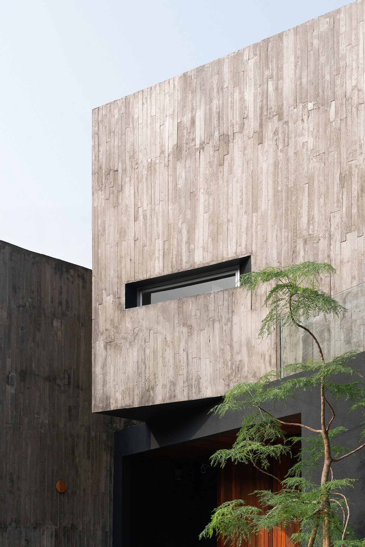 The overall massing is sculptural and geometric. Volumes appear to interlock and cantilever, creating dynamic shadow play and a sense of weightlessness despite the heavy material palette. The front elevation juxtaposes the roughness of concrete with the warmth of vertical wooden cladding, producing a visual balance between industrial austerity and natural tactility. A minimalist garden punctuates the entrance, featuring a single tree whose organic form softens the rigid architectural lines, offering a tranquil transition between exterior and interior realms.