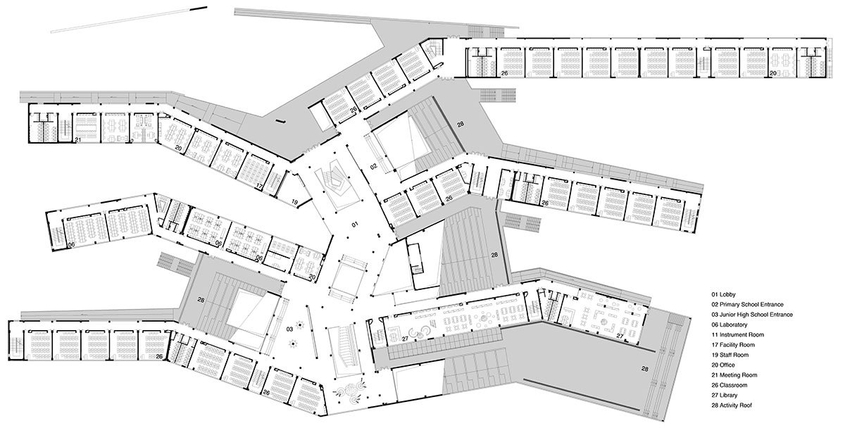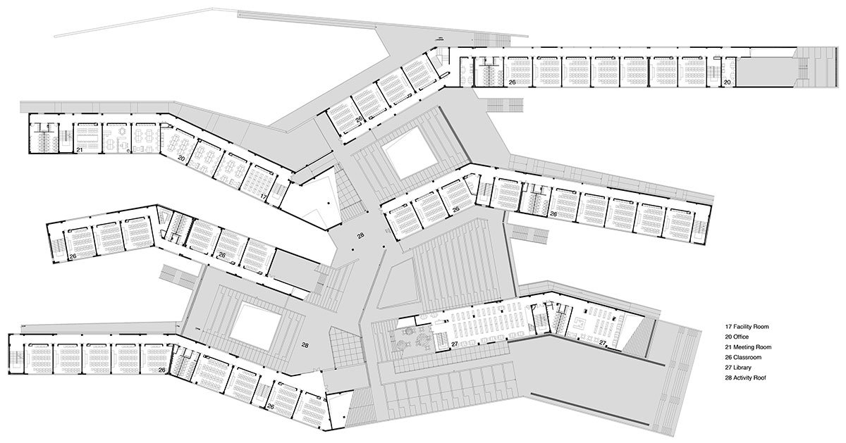 An interesting mix of landscape and building makes different space experiences for the students. The intersection parts of different roofs form the public lobby with patios around, this not only blurs the distinction between interior and exterior but also organically connects different programs such as classrooms, office, library, etc.